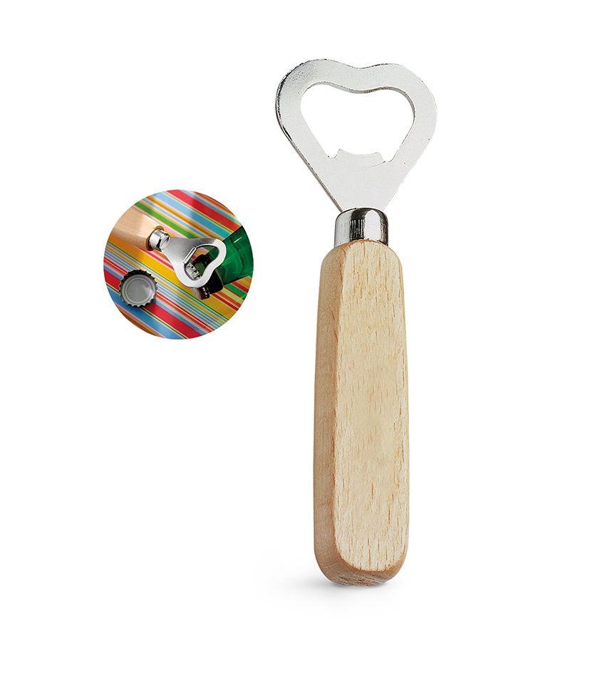 Abridor de garrafas em metal com cabo de madeira, medidas 150 x 17 x 40 mm. Gravação a laser.