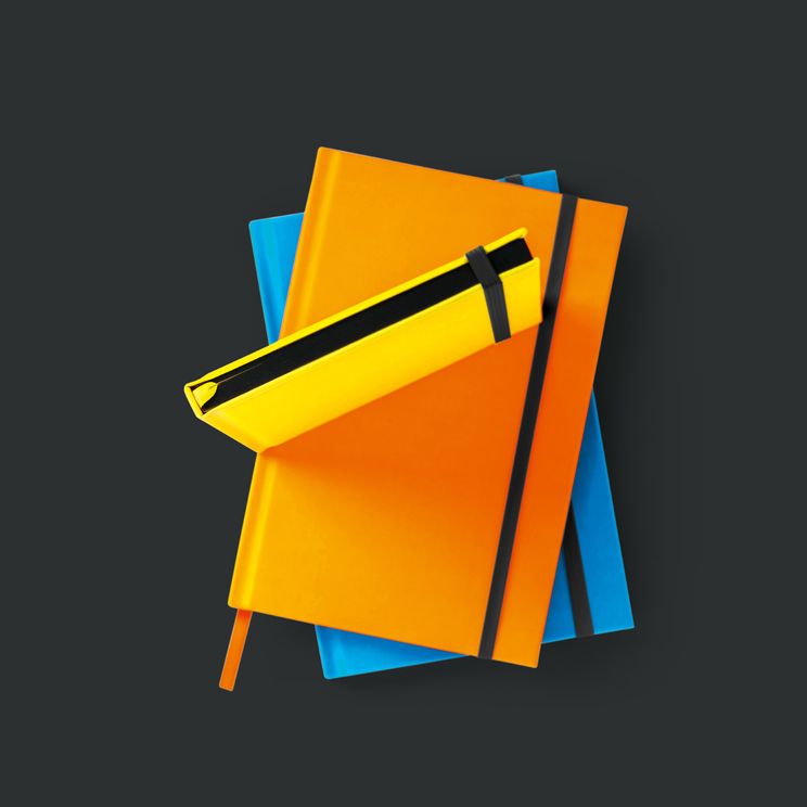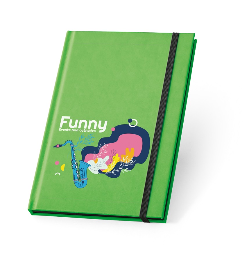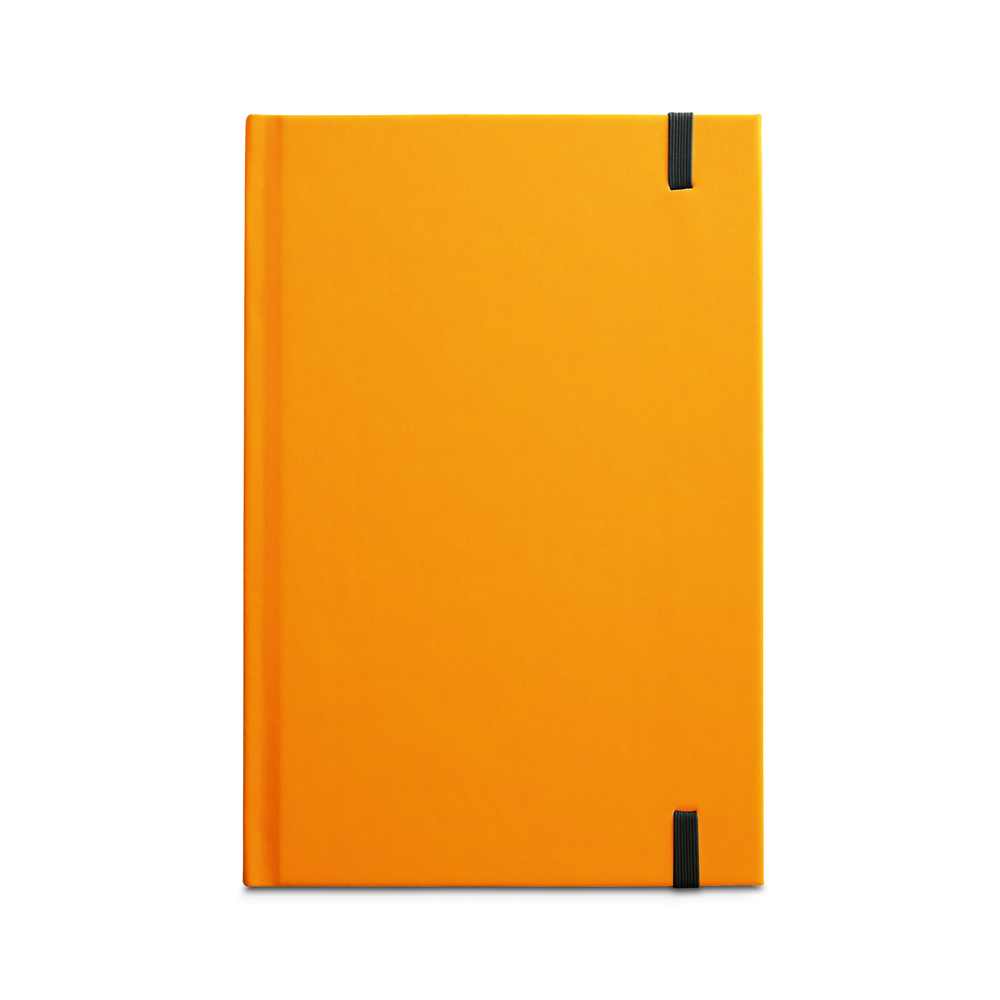Caderno/ bloco de anotações capa dura produzido em PU fluorescente, possui 96 folhas pautadas com elástico preto na capa, medidas 140 x 210 mm. Gravação serigrafia em 1 cor.