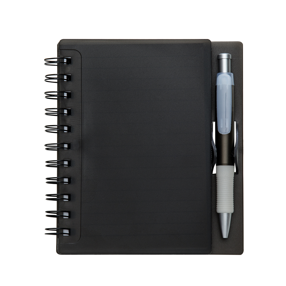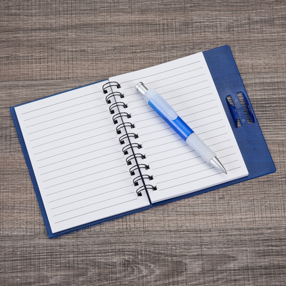 Bloco de anotações com capa de plástico resistente e caneta esferográfica.Contém aproximadamente 70 folhas, Tamanho da capa (CxL):15,7 cm x 10,9 cm, Tamanho do verso (CxL):15,7 cm x 13,5 cm. Gravação serigrafia em 1 cor na caneta e capa do bloco.