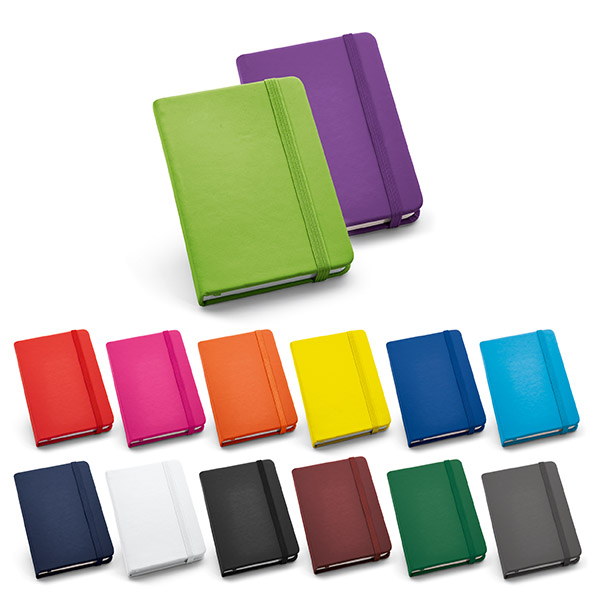 Bloco de anotações com 80 folhas brancas e elástico na capa, Medidas 14 x 9 cm. Gravação baixo relevo ou serigrafia em 1 cor.