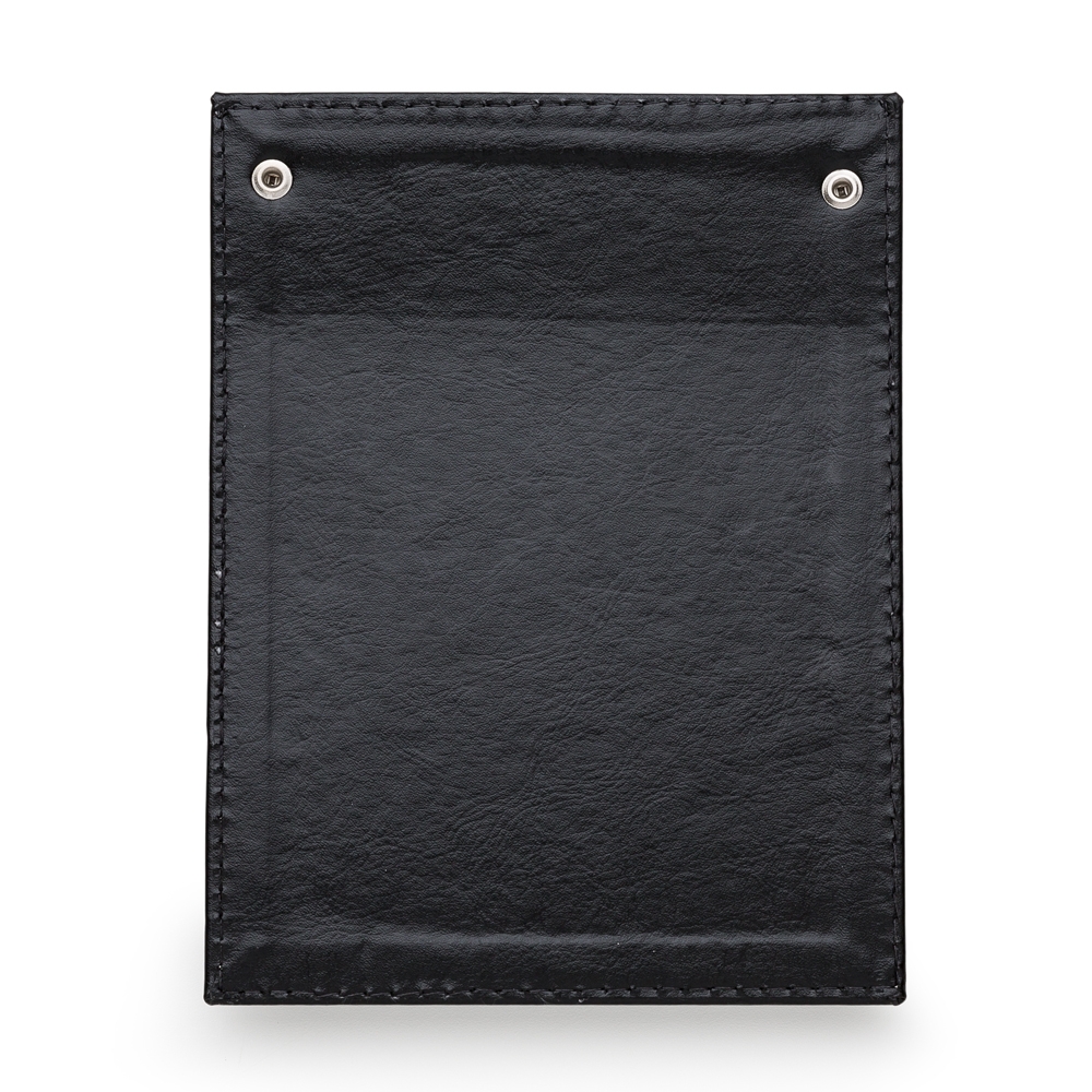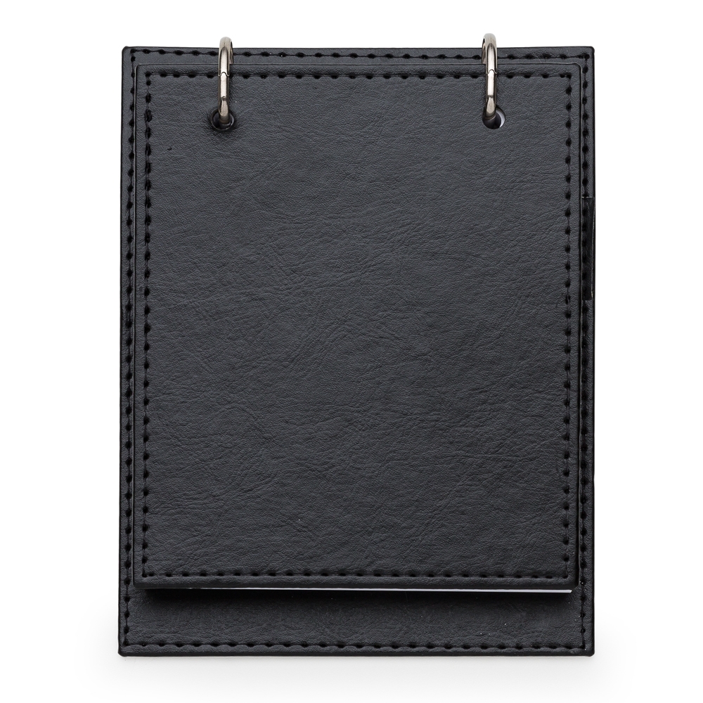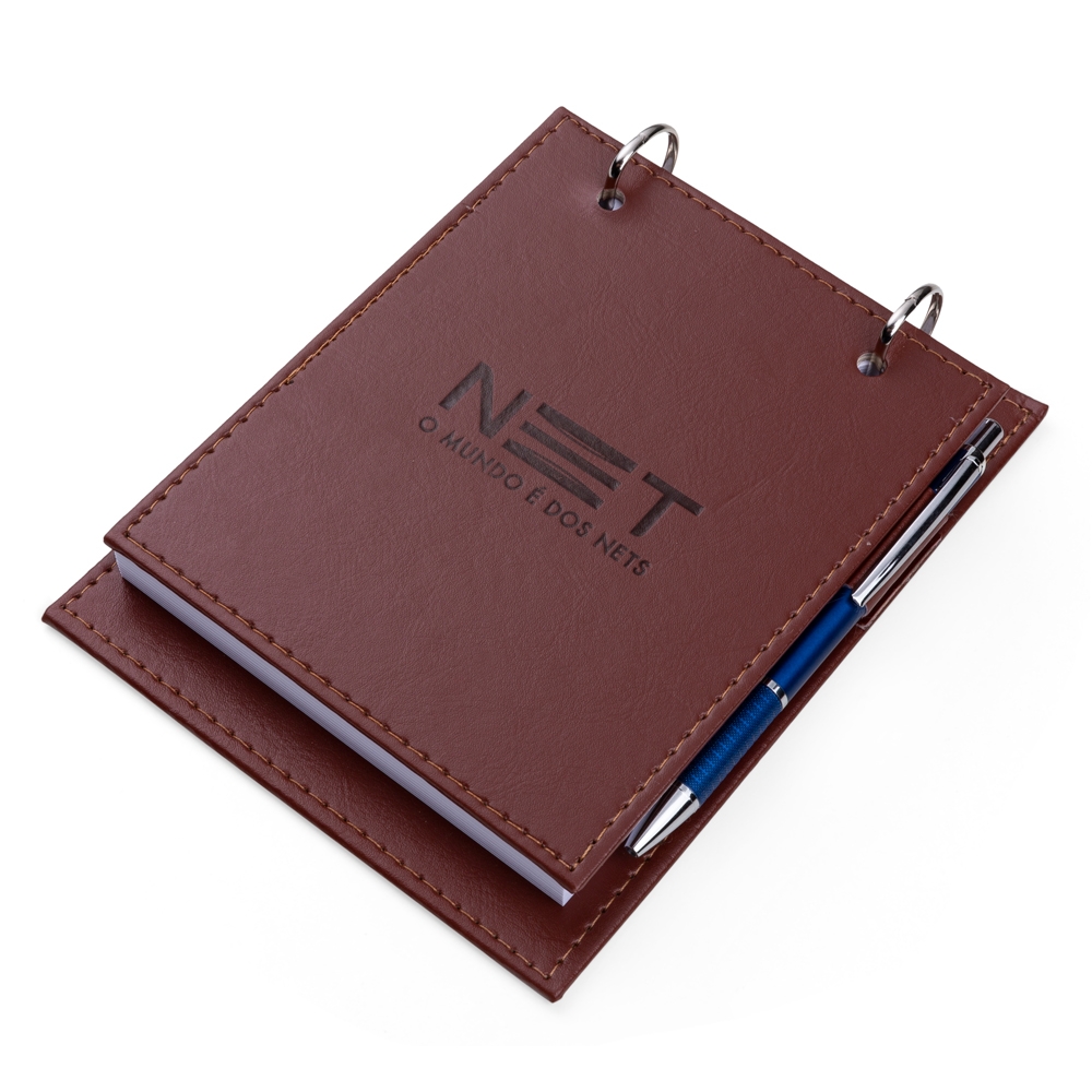 Bloco de anotação de mesa, material couro sintético. Possui suporte para colocar caneta e aproximadamente 200 folhas sem pauta. Medidas 19,9 cm x 14,9 cm. Gravação baixo relevo.