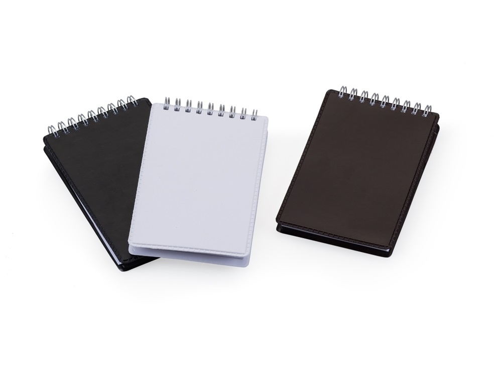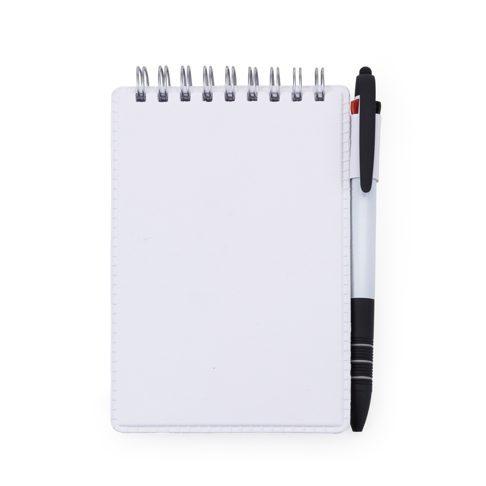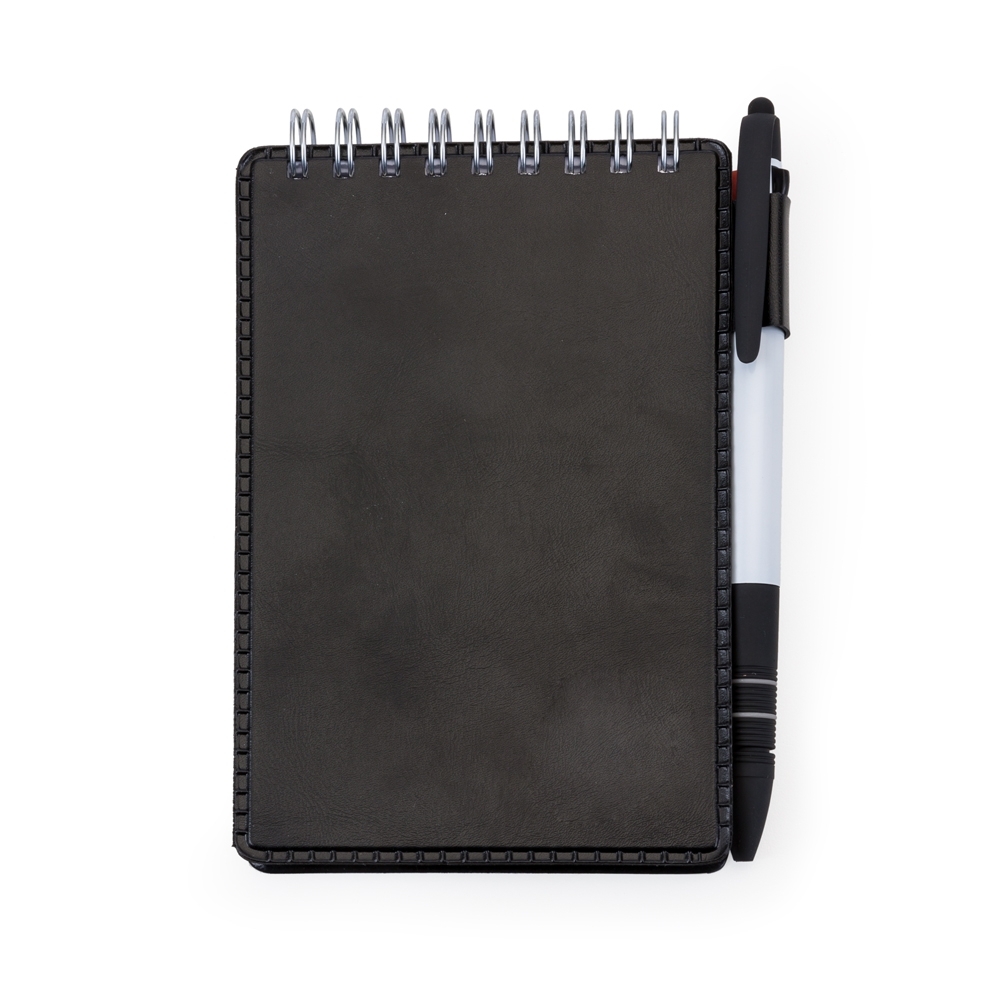 Bloco de anotações de couro sintético com suporte para caneta, frente e verso liso. Abertura superior, possui espiral prata e acompanha aproximadamente 95 folhas brancas sem pauta e suporte na lateral direita para caneta, medidas 14,9 cm x 9,1 cm. Gravação serigrafia em 1 cor.