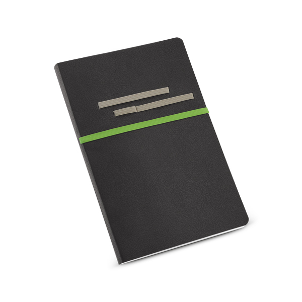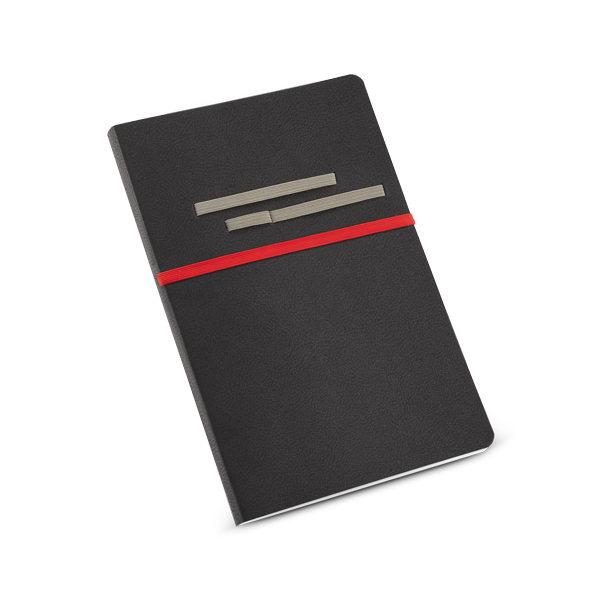 Caderno capa em sintético, com 96 folhas não pautadas com porta caneta, fornecido em embalagem de TNT, medidas 140 x 210 mm. Gravação serigrafia em 1 cor.