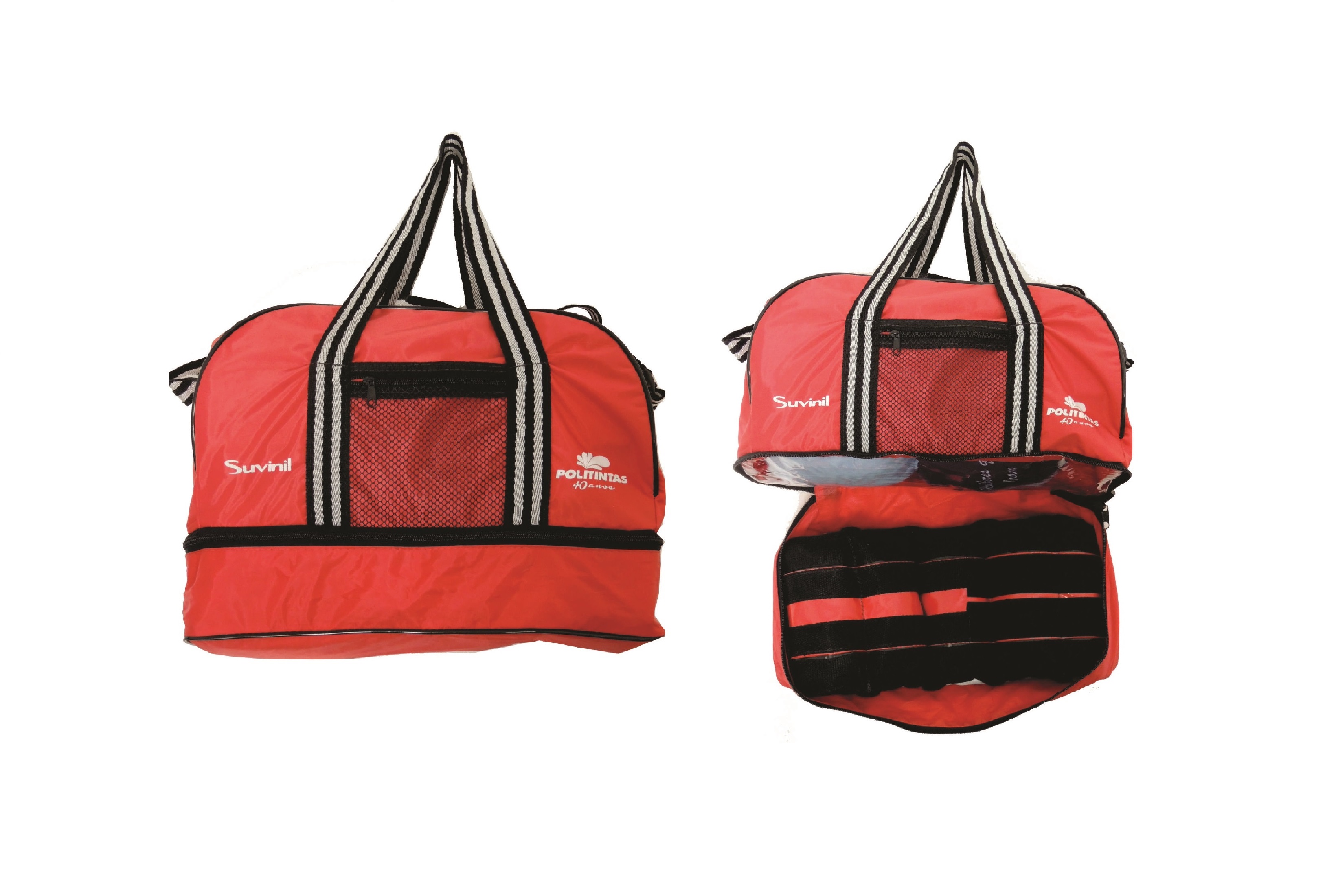 Bolsa modelo de viagem em Nylon 70 com alca de mão e tira colo, abertura superior e inferior com zíper,compartimento com divisória na parte inferior da bolsa. Medidas 34x42x20 cm, Gravação serigrafia ou bordado.