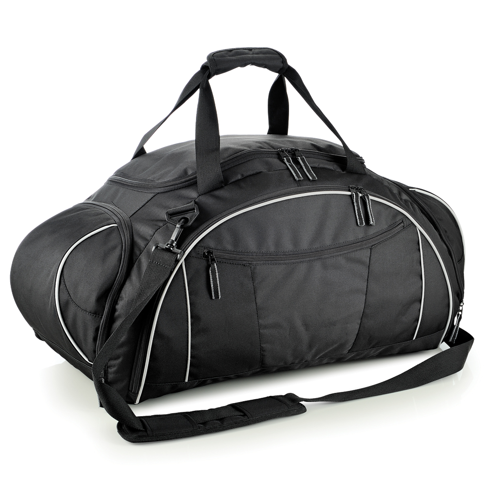 Bolsa / Mala Esportiva preta em Nylon e Polyester 300D. Conta com alça de ombro ajustável, alça de mão, cinco divisões com zíper, sendo, dois laterais, dois frontais e um superior. Capacidade: 50 litros.Dimensões: 68x33x28cm. Gravação silk emborrachado em 1 cor.