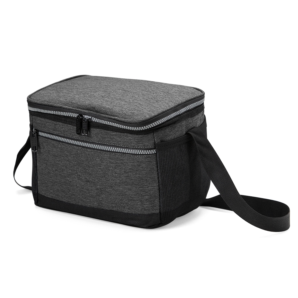 Bolsa térmica de nylon 10 litros com dois compartimentos, sendo o principal com revestimento térmico e bolso telado para utensílios. Possui bolsos laterais em malha e alça transversal com apoio para ombro.
