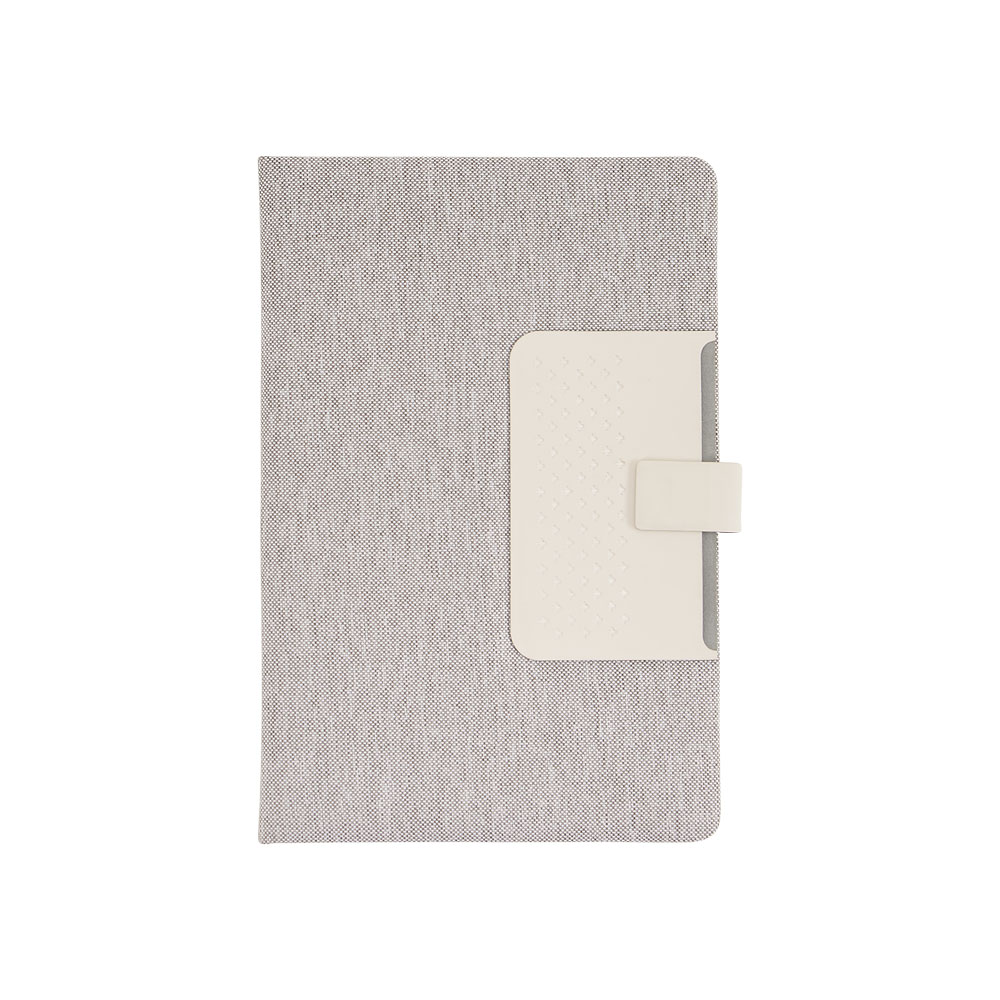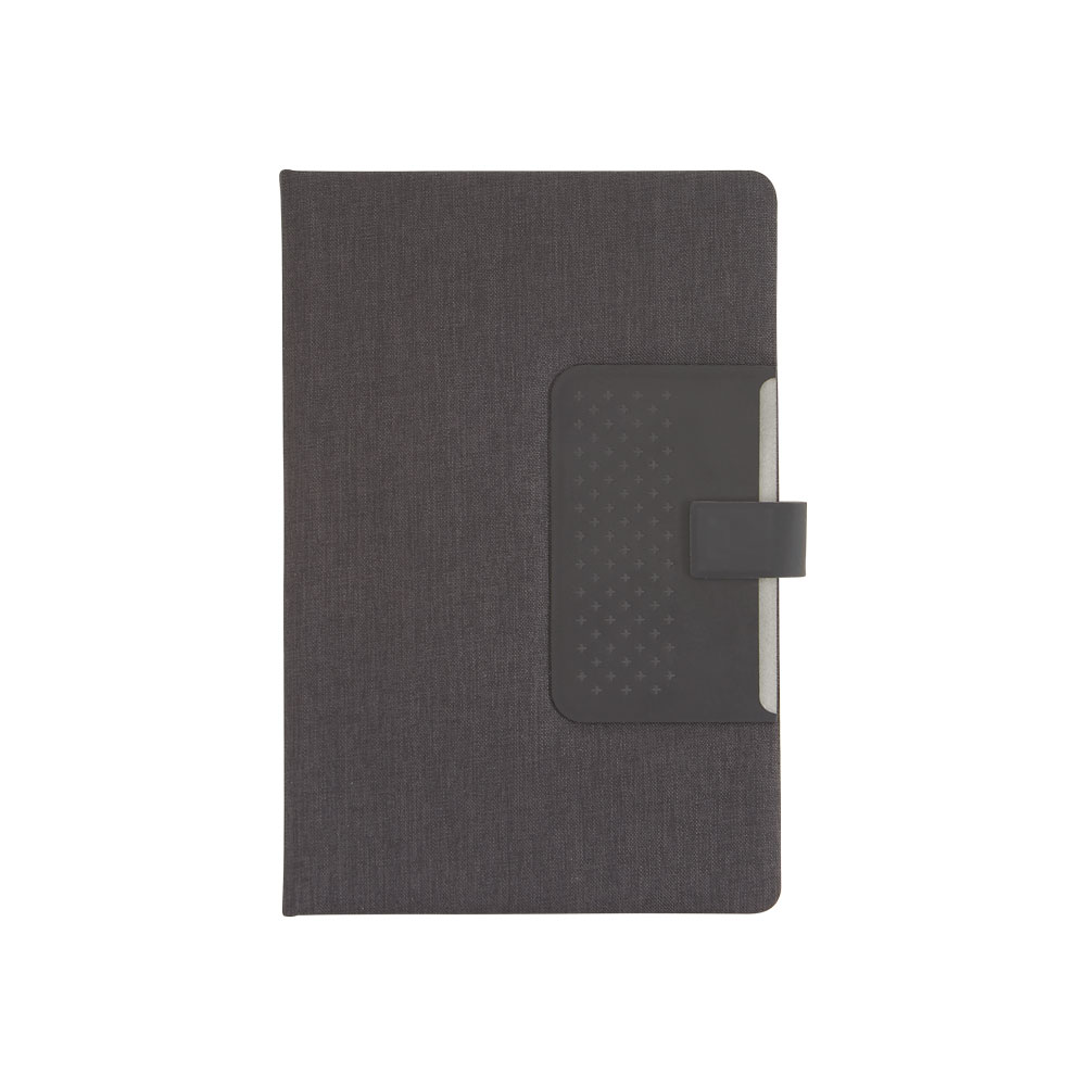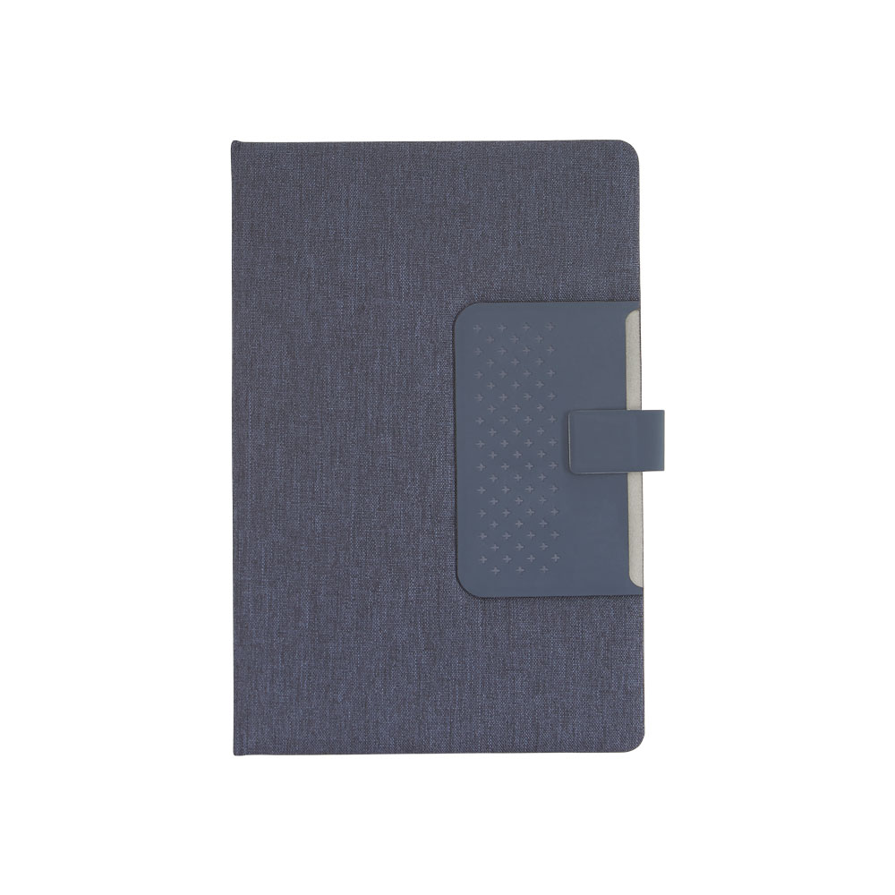 Caderno de anotações com suporte para caneta, fechamento magnética, capa dura em material sintético, miolo 80 folhas pautadas na cor bege, medidas 21×14 cm. Gravação serigrafia em 1 cor.