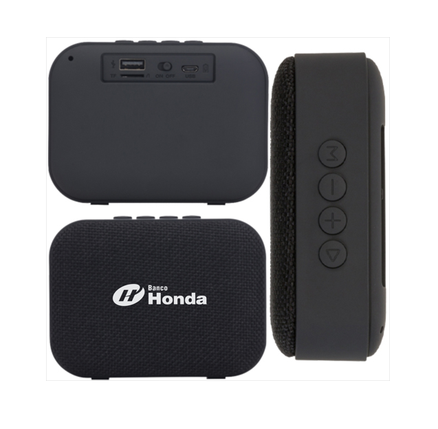 Caixa de Som Multimídia. Produzida em material emborrachado, tela de proteção do auto-falante em tecido, parte inferior com borrachas anti-deslizantes. Possui os botões de Play/Pause; Aumentar e diminuir volume/avançar e retroceder faixas; Modo; Entrada USB; Entrada TF (cartão MicroSD); Botão On/Off e Entrada DC 5V. Funções: botão M(Modo): ao pressionar este botão ele alterna entre os modos bluetooth, USB(pen drive), TF(cartão MicroSD), rádio FM (neste modo é necessário o cabo como antena na entrada DC 5V, pressionar o botão play uma única vez no modo rádio para iniciar a sintonização automática). Botão -: ao segurá-lo irá diminuir o volume e ao pressionar irá retroceder a faixa. Botão +: ao segurá-lo irá aumentar o volume e ao pressionar irá avançar a faixa. Botão Play/►: ao pressioná-lo irá iniciar/pausar uma música, no modo rádio é utilizado para sintonização e no modo chamada basta pressioná-lo para atender uma ligação. Bluetooth V 4.2; Alcance 10 metros; Voltagem DC 5V; Carga da bateria de 2 à 3 horas aproximadamente; Falante 4Ω3W; S/N >95db; Frequência de resposta 280HZ-16KHZ. Acompanha cabo USB.