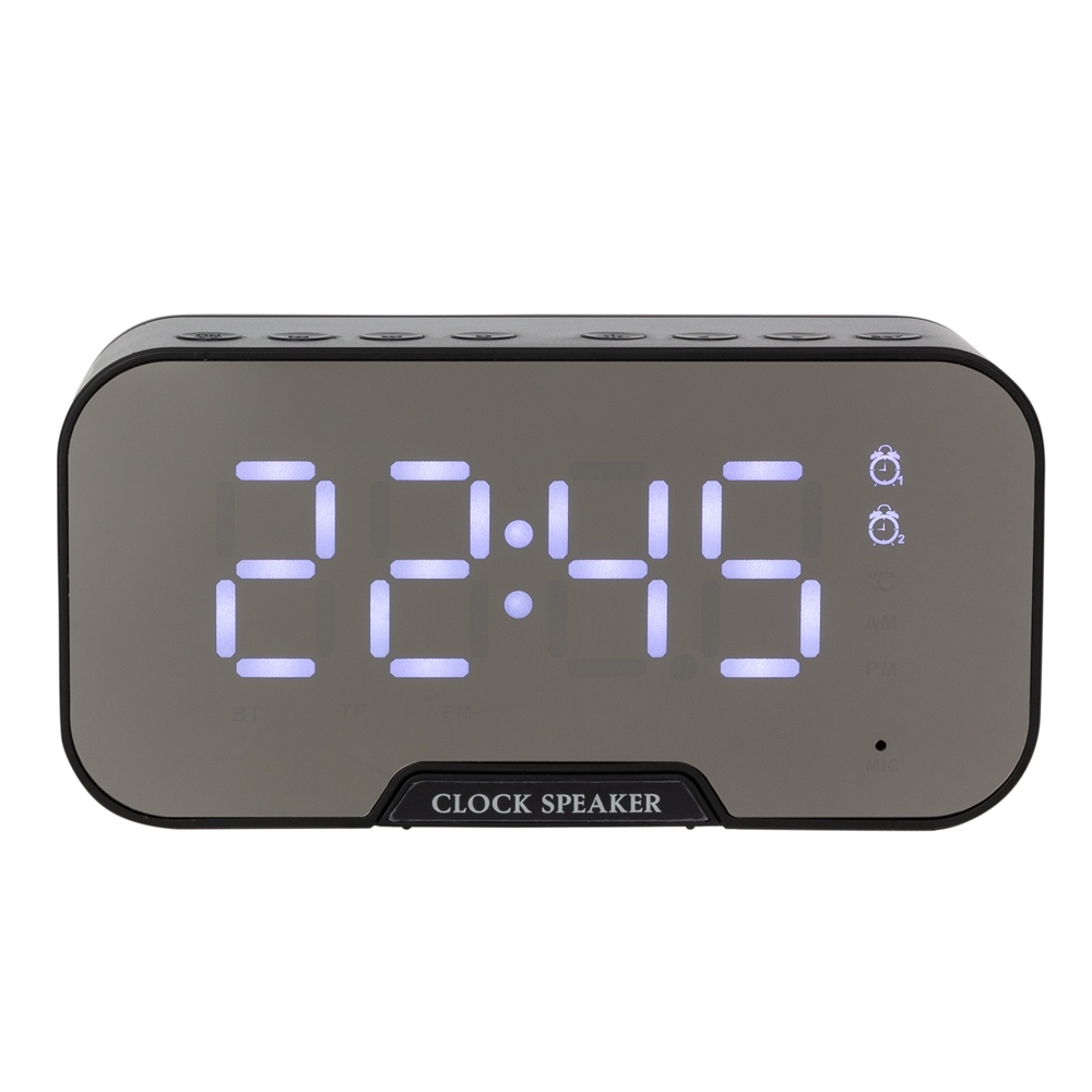 Caixa de som multimídia com relógio despertador e suporte para celular. Produzida em plástico e com borrachas antiderrapantes na área inferior, a caixa de som tem a área frontal espelhada e display de LED, além de um compartimento com suporte para celular – uma espécie de “gaveta” aonde é exibido (CLOCK SPEAKER), basta puxá-la ter acesso ao compartimento. A caixa de som executa nos modos bluetooth, rádio FM, cartão TF-microSD (até 16GB) e entrada auxiliar P2, para alternar entre os modos basta pressionar o botão M (modo); ao segurar o botão ON ▸|| o produto será ligado/desligado, ao pressioná-lo irá iniciar/pausar a faixa; os botões l◂◂ e ▸▸l ao serem pressionados irão retroceder ou avançar as faixas, ao serem segurados irão diminuir ou aumentar o volume; o botão ❊alterna a luminosidade do display entre 3 níveis; os botões < e > ao serem pressionador durante o modo de configuração, irão ajustar o relógio, despertador e toque do alarme; o botão SET ao ser pressionado irá alterar entre 4 opções: relógio, ativação alarme 1 (será exibido o símbolo do despertador 1), ativação alarme 2 (será exibido o símbolo do despertador 2) e ativação alarmes 1 e 2 (serão exibidos os símbolo dos despertadores 1 e 2), para cada modo escolhido, segure o botão SET para iniciar a configuração e depois o pressione para avançar ao próximo ajuste – no modo despertador é possível escolher entre 5 alarmes para reprodução. Para usufruir adequadamente da função de rádio, é necessário conectar o cabo microUSB para que este sirva como uma antena receptora de sinal, feito isso pressione o botão ON ▸|| para iniciar a sintonização automática. Além destas funções, o relógio tem exibição de temperatura em graus Cº, display com exibição de volume, exibição de sintonia das rádios e função para atendimento de chamadas telefônicas (necessário estar conectado ao bluetooth). Bluetooth V 5.0; Frequência de resposta 80Hz-20KHz; Frequência de rádio 87.5MHz-108MHz; Bateria de lithium 3.7V com 1400mAh; Distância de alcance 10 metros; Voltagem DC 5V; Falante 4Ω3W; SNR ≥65db e distorção <0,5% . Acompanha cabo USB e manual em inglês. Medidas: Altura : 6,8 cm x Largura : 4,6 cm x Comprimento : 13,8 cm Gravação serigrafia em 1 cor.