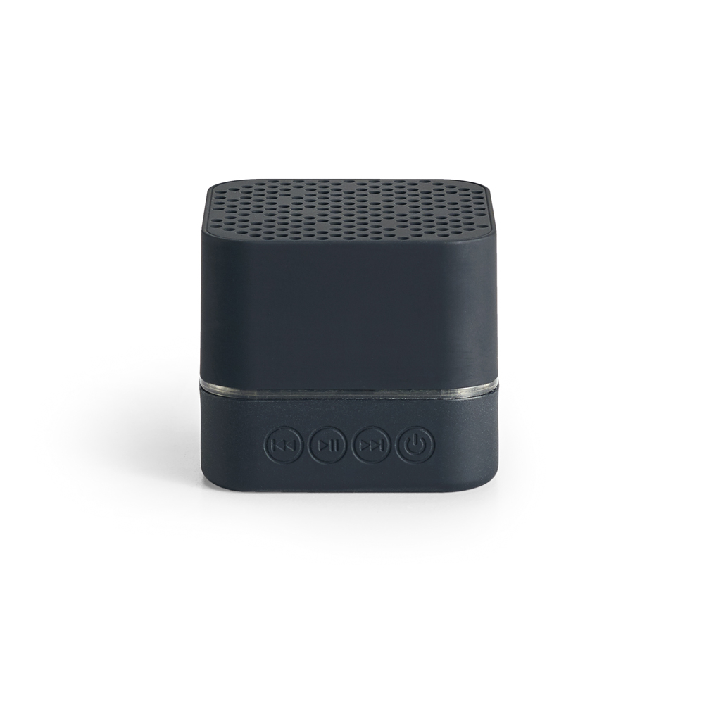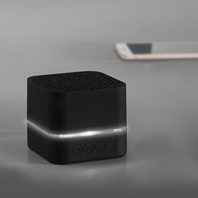 Caixa de som produzida em ABS com acabamento emborrachado, possui luz LED no seu interior, transmissão por bluetooth. Personalizável com logotipo iluminado, autonomia: > 2h. Bateria: 300mAh. Inclui cabo USB – micro USB para carregamento, medidas 59 x 59 x 51 mm. Gravação a laser.