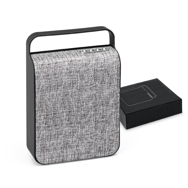 Caixa de som com microfone produzida em ABS e tecido em poliéster com acabamento emborrachado. Possui transmissão por bluetooth, ligação stereo 3,5 mm e leitor de cartões TF. Com 2 x 3W/4Ω. Autonomia até 3 h. Função para atender chamadas, controle de volume, conexão à playlist do dispositivo móvel e rádio FM. Incluso cabo USB para carregar, medidas 155 x 230 x 55 mm . Gravação serigrafia em 1 cor.