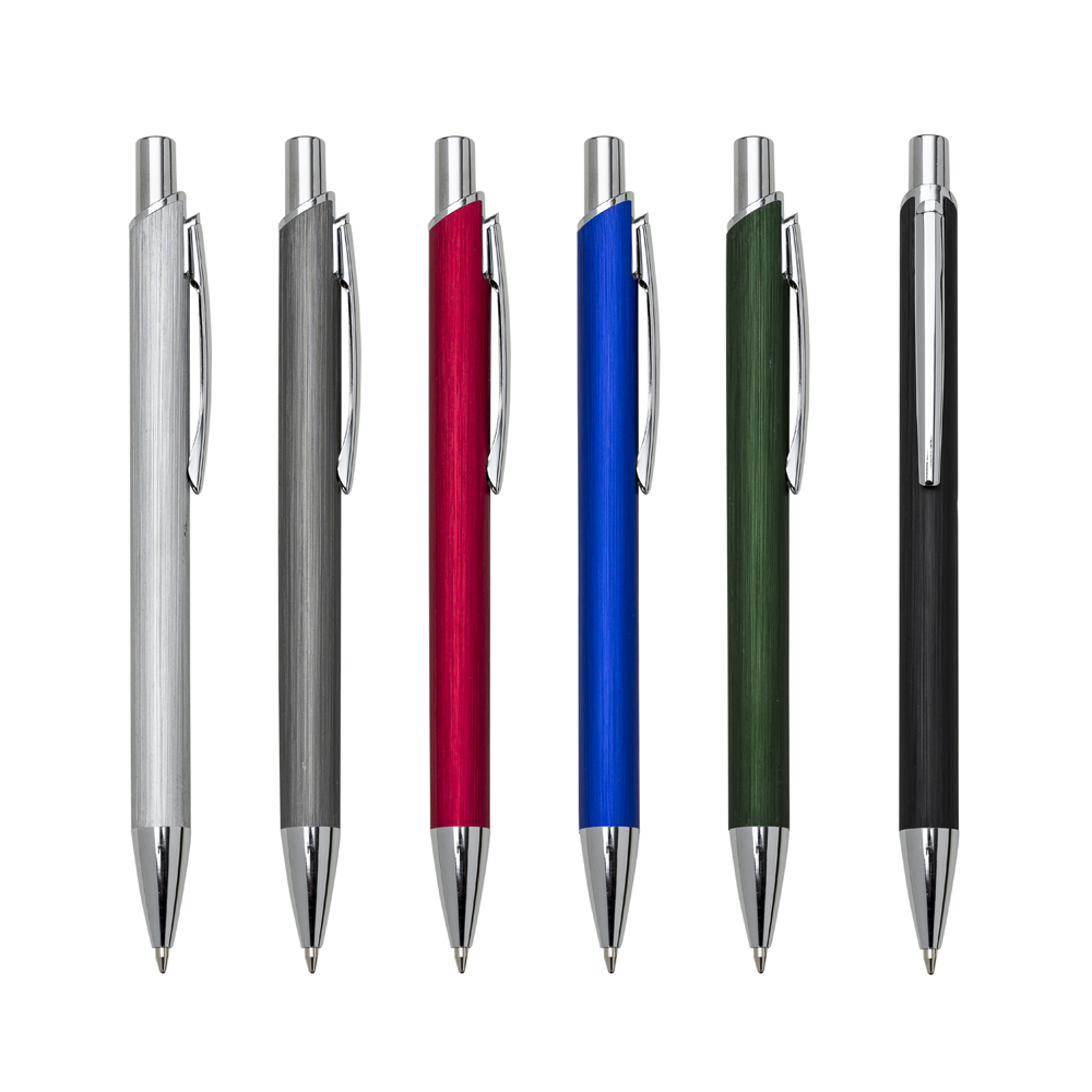 Caneta alumínio inteira colorida com detalhes prata, pintura tipo escovada. Clip metal, acionador e ponteira prata, aciona por clique. Gravação a laser.