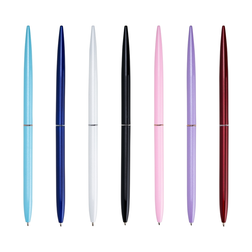 Descrição: Caneta metálica com acionamento por rotação e carga esferográfica azul 1mm.