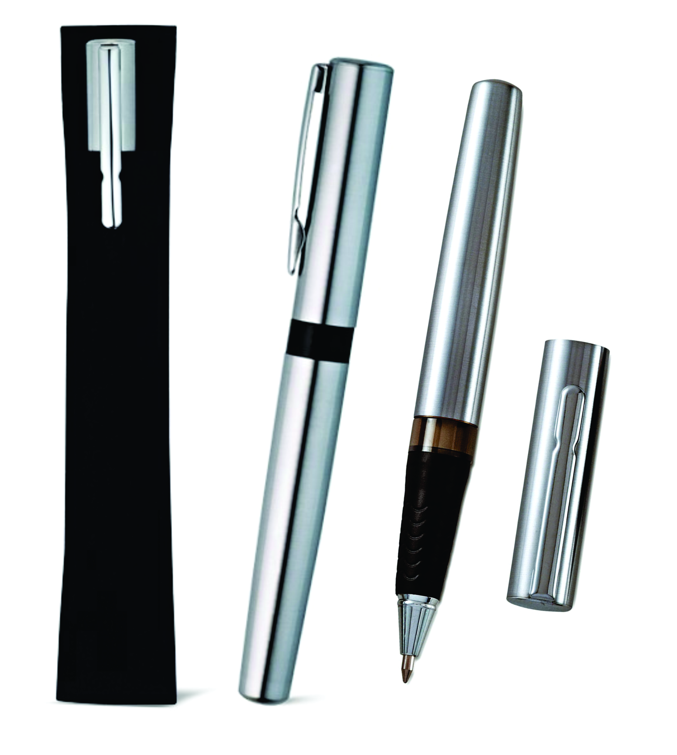 Caneta em Aço Inox com tampa, acabamento Escovado Fosco, clip Cromado Brilhante, grip emborrachado e detalhe fumê. Carga esferográfica com tinta azul. Gravação a Laser.