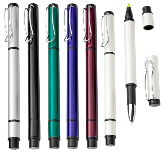 Caneta metal marca texto inteira colorida com detalhes preto. Clip de metal na cor prata, possui tampa em ambos lados(caneta esferográfica e marca texto). Marca texto apenas amarelo. Gravação a laser.