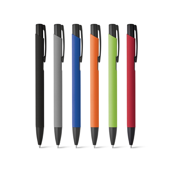 Caneta Esferográfica com corpo metálico e acabamento emborrachado, possui 1,5 km de escrita, medidas ø 10 x 137 mm. Gravação a laser.
