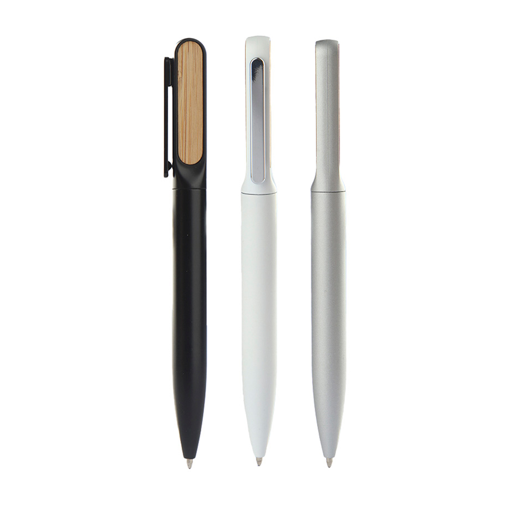Caneta esferográfica de metal com detalhe em bambu, escrita em azul. Acompanha estojo em papelão, semelhante a cor bambu.