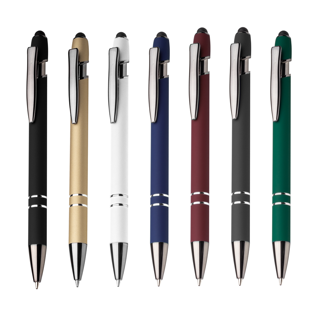 Caneta esferográfica em metal escrita em azul com corpo emborrachado. Refil tipo parker com ponta touch emborrachada.