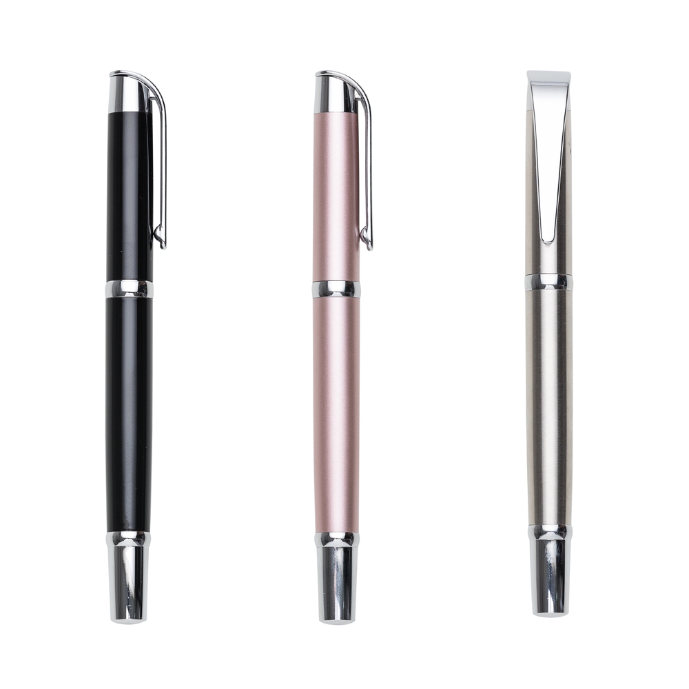 Caneta roller metal brilhante tipo tinteiro, escrita preta. clip metal, parte inferior com detalhe preto brilhante, com ta