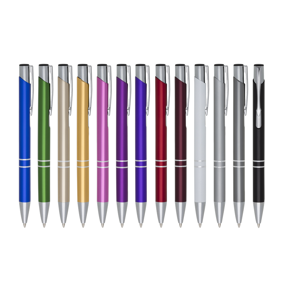 Caneta metal inteira colorida com detalhes prata. Clip metal com a ponta do acionador preto, parte inferior com dois anéis prata. Aciona por clique. Gravação a laser.