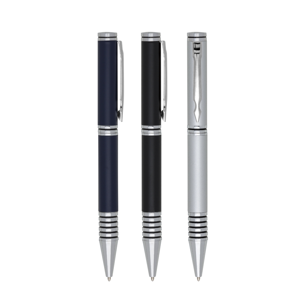 Caneta metal inteira colorida com detalhes prata. Clip metal, possui anel preto em relevo na parte superior e no centro. Seis anéis prata na parte inferior com um detalhe preto, aciona por giro. Gravação a laser.