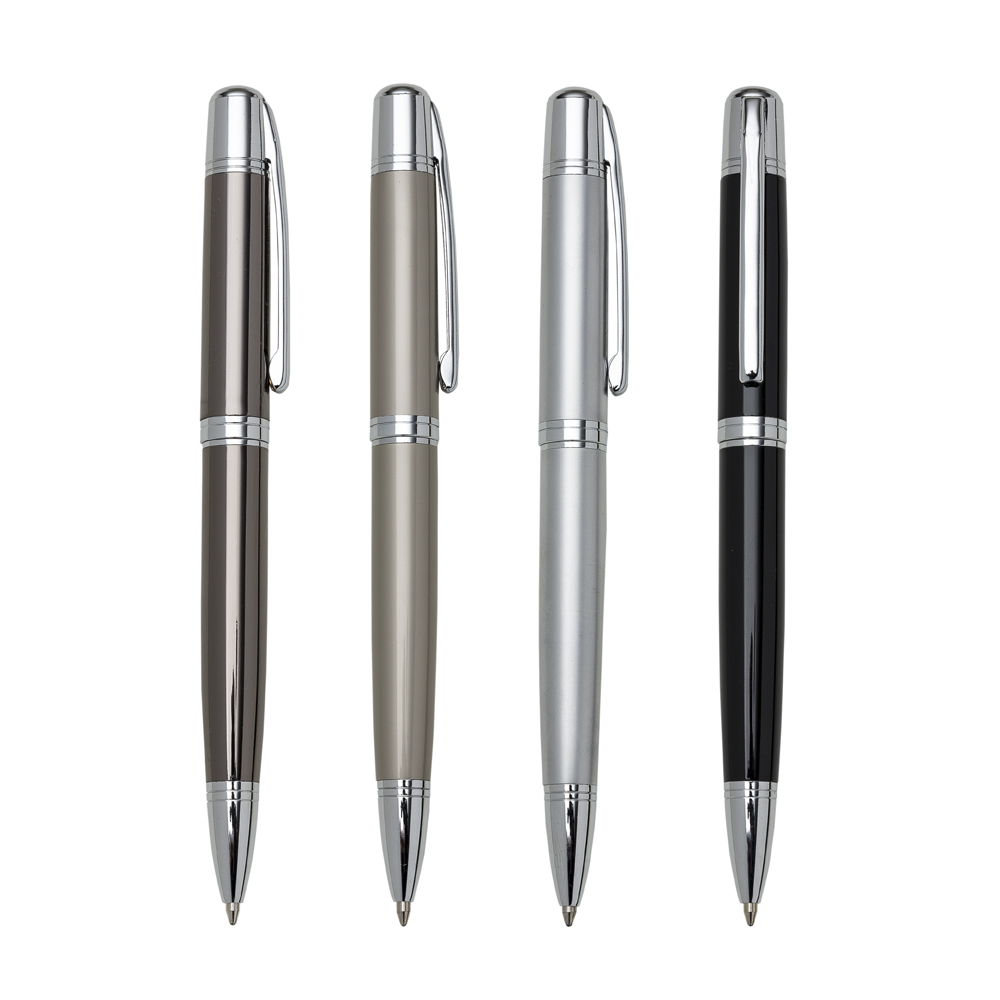 Caneta metal inteira colorida com detalhes prata. Clip metal com dois anéis em relevo, anel centralizado e dois anéis em relevo na ponteira, aciona por giro. Gravação a laser.