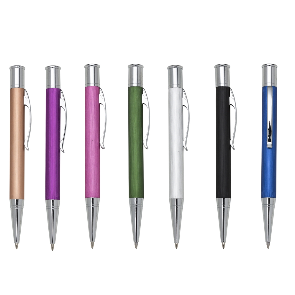 Caneta metal corpo inteiro fosco colorido com detalhes prata. Clip metal, possui um anel no acionador e dois anéis na ponteira, aciona por giro. Gravação a laser.