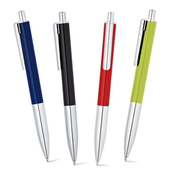 Caneta esferográfica com corpo metálico, aciona por click. Gravação a laser.