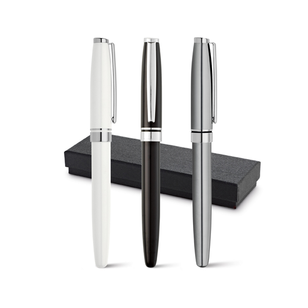 Caneta Roller com corpo metálico , incluso estojo almofadado. Medidas caneta ø12 x 136 mm | Estojo: 175 x 55 x 25 mm. Gravação serigrafia em 1 cor no estojo e laser na caneta.