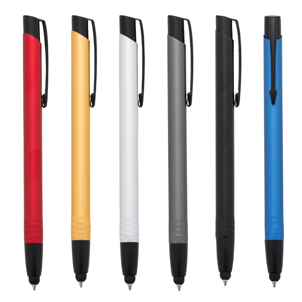 Caneta de metal colorida com detalhes preto e ponteira touch. Clip de metal, parte inferior possui quatro “anéis” em relevo, Aciona por clique a caneta sai por dentro da borracha touch. Gravação a laser.