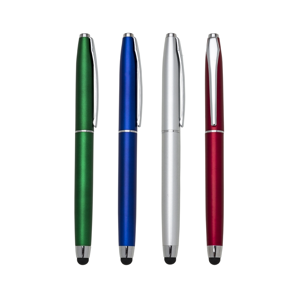 Caneta plástica touch inteira colorida com detalhes em prata. Possui tampa e clip de metal, anéis: superior, central e inferior em prata. Para utilizar esferográfica basta tirar a tampa, touch fica do lado oposto. Gravação serigrafia.