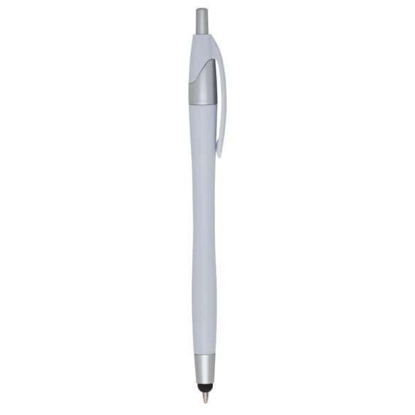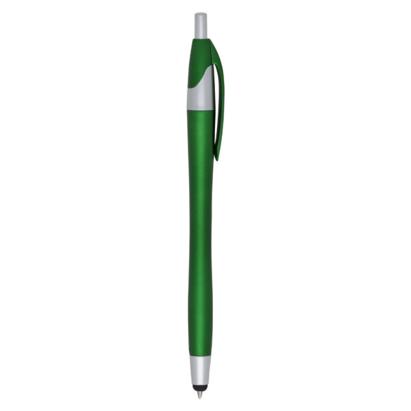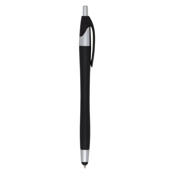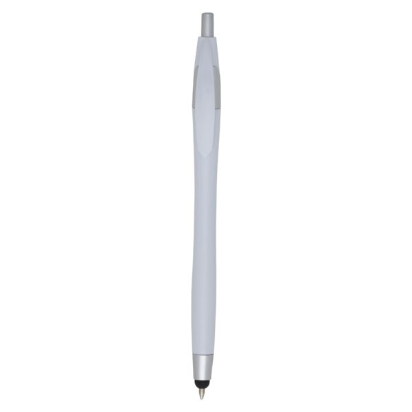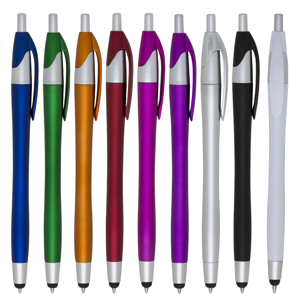 Caneta plástica com ponteira touch, inteira colorida com detalhes prata. Aciona por clique, ponteira sai através da borracha touch. Gravação serigrafia.