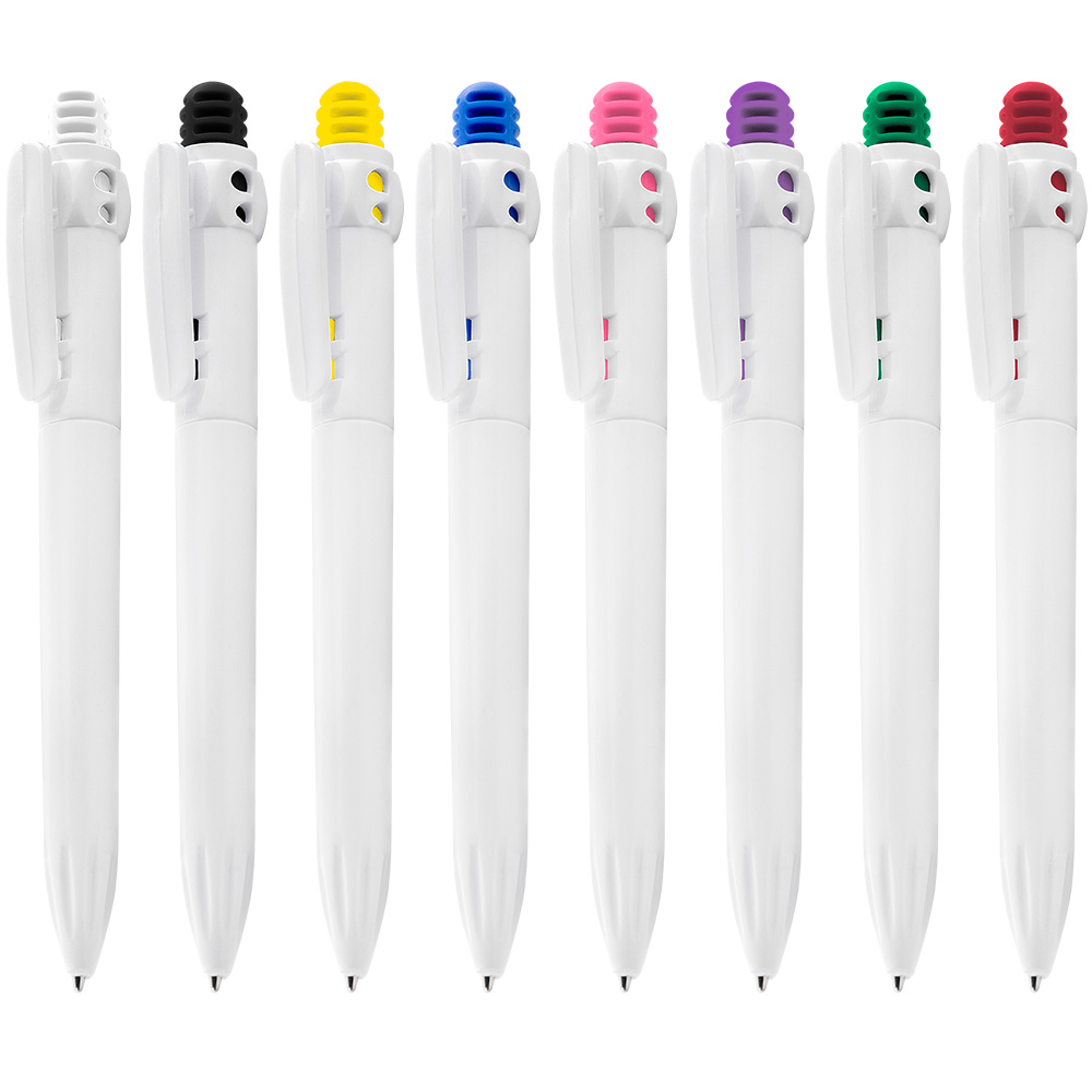 Caneta plástica esferográfica retrátil com grip, escrita azul e disponível em diversas cores. Confortável, funcional e ideal para ações promocionais.