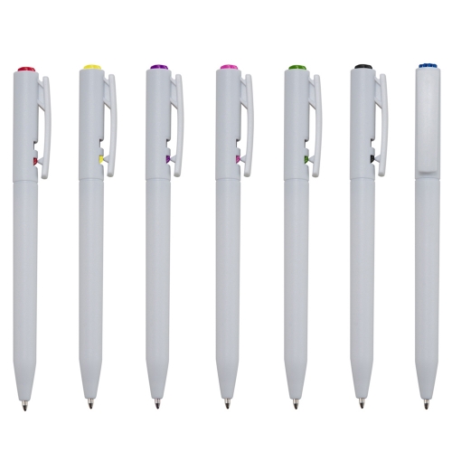 Caneta esferográfica plástica branca com detalhes coloridos, anel central e acionador em relevo. Aciona por clique e para destravar basta apertar a parte inferior do clip. Gravação serigrafia em 1 cor.