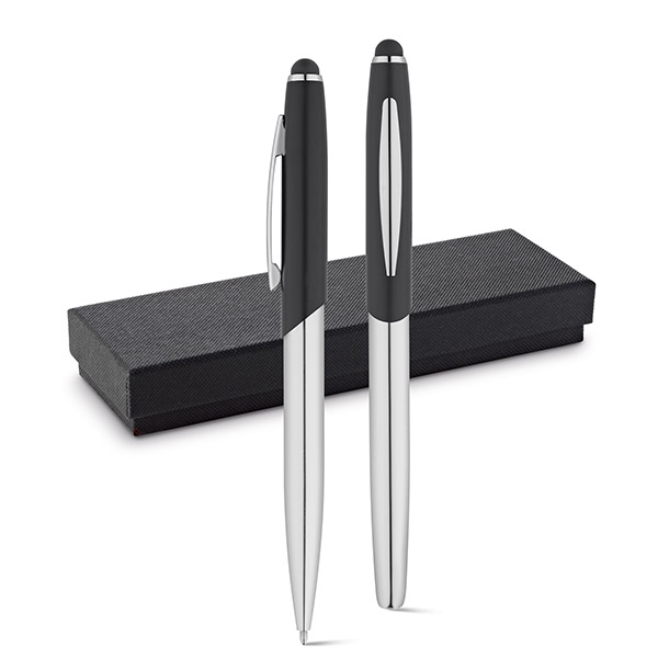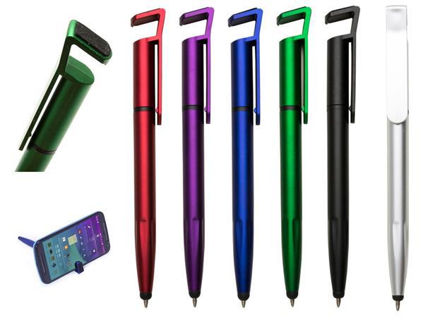 Caneta plástica touch com suporte para celular, caneta inteira colorida com detalhes preto. Clip plástico aberto utilizado como suporte para o celular e parte superior com limpador de tela, possui anel preto abaixo do clip e parte inferior com detalhes em relevo. Aciona por giro. Gravação serigrafia.