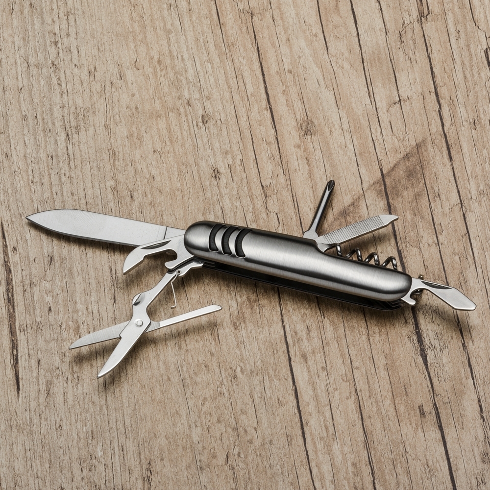 Canivete metal 7 funções com detalhes emborrachados preto(três linhas frente e verso). Possui: lâmina de corte, mini tesoura, abridor de lata, abridor de garrafa, chave phillips, lixa e saca rolhas, acompanha bolsa protetora de nylon, medidas 9,2 cm x 2,5 cm. Gravação a laser.