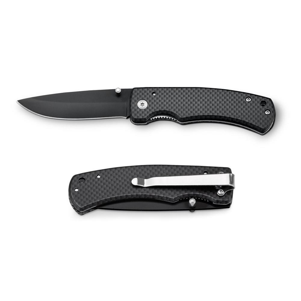 Canivete em aço inox e metal com fecho de segurança e clipe, medidas. 97 x 15 x 29 mm. Gravação a laser.