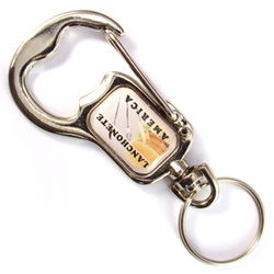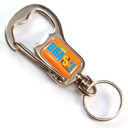 Chaveiro modelo abridor de garrafa metálico com mosquetão e argola, personalização através de etiqueta resinada em policromia.