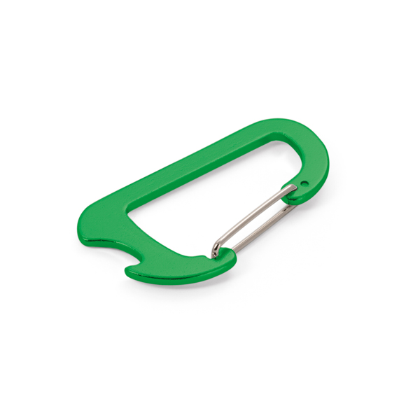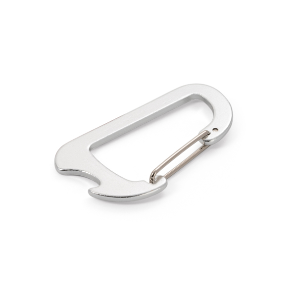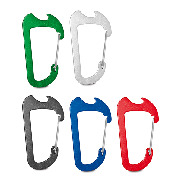 Chaveiro em alumínio modelo mosquetão com abridor de garrafas. Não adequado para escalada esportiva, medidas 44 x 79 x 3 mm. Gravação a laser.