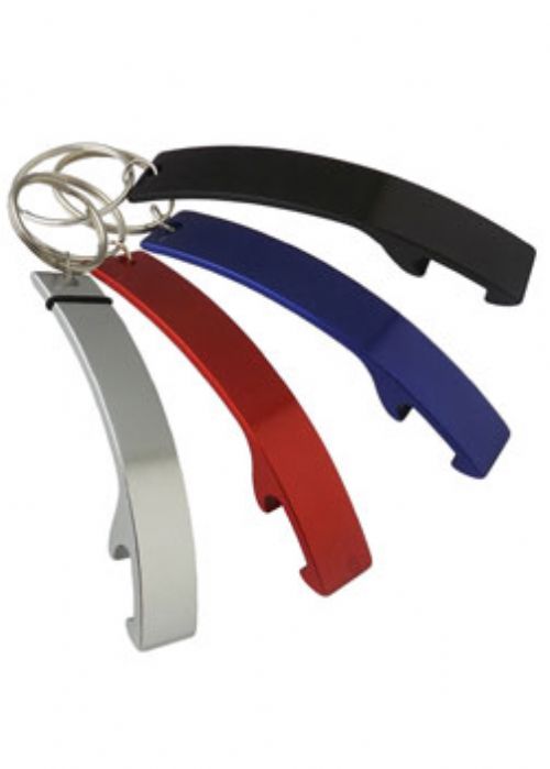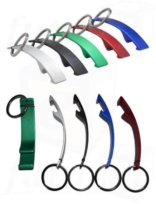 Chaveiro modelo abridor em metal com argola, gravação a laser.