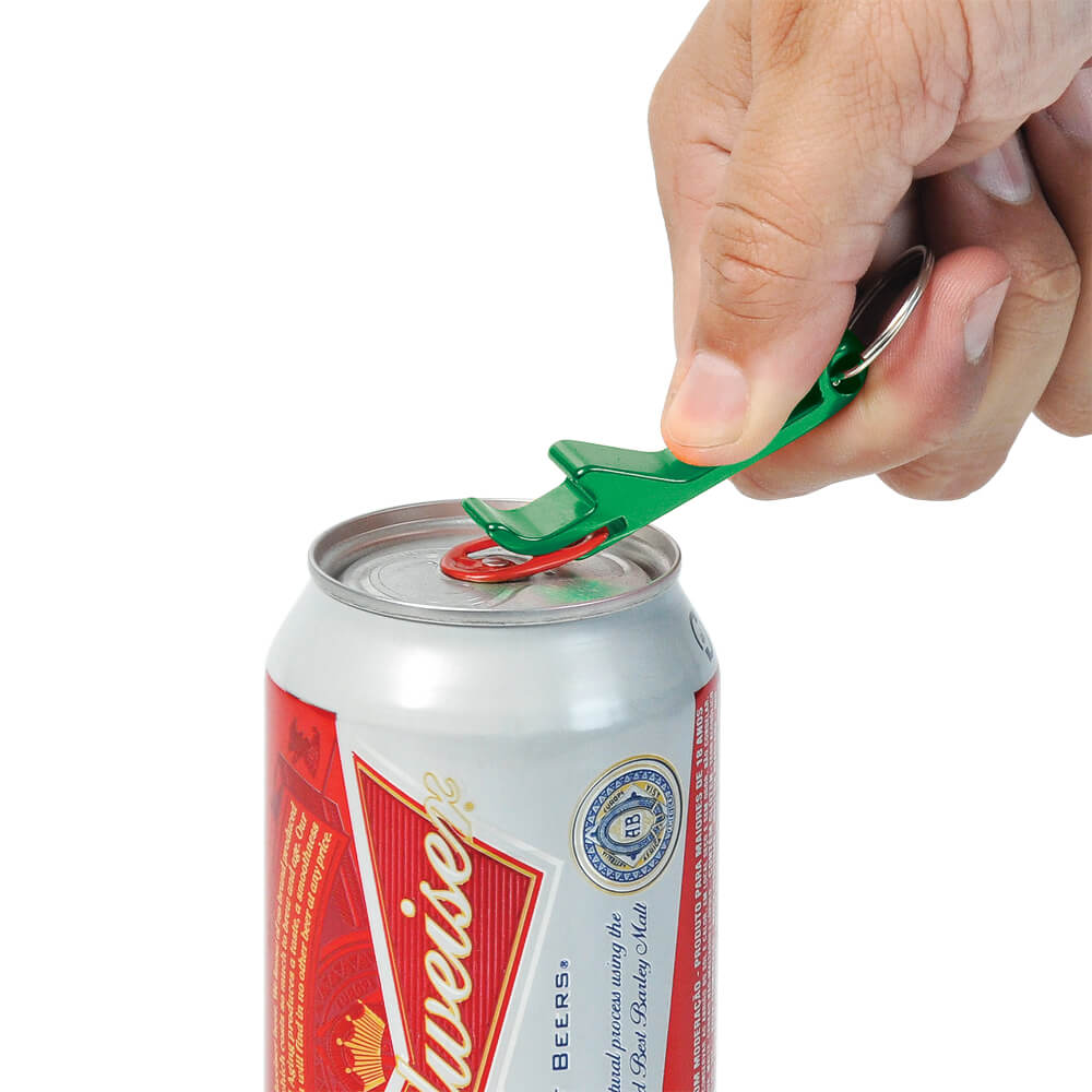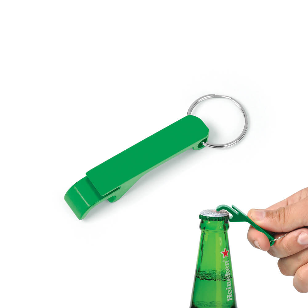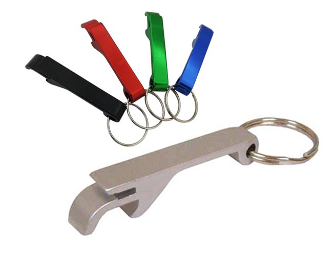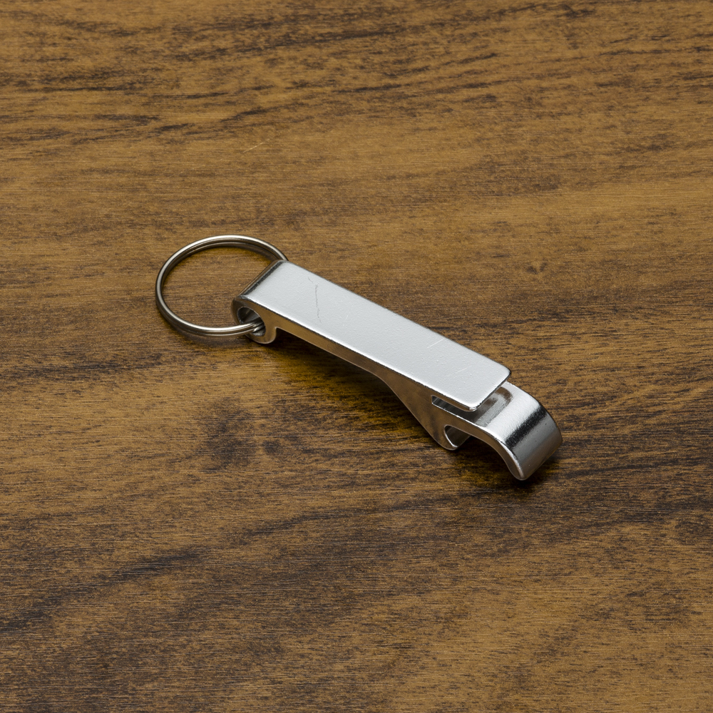 Chaveiro em metal modelo abridor de lata e garrafa, gravação a laser.
