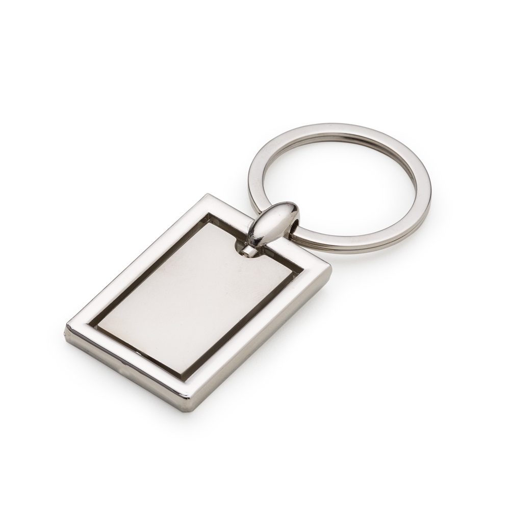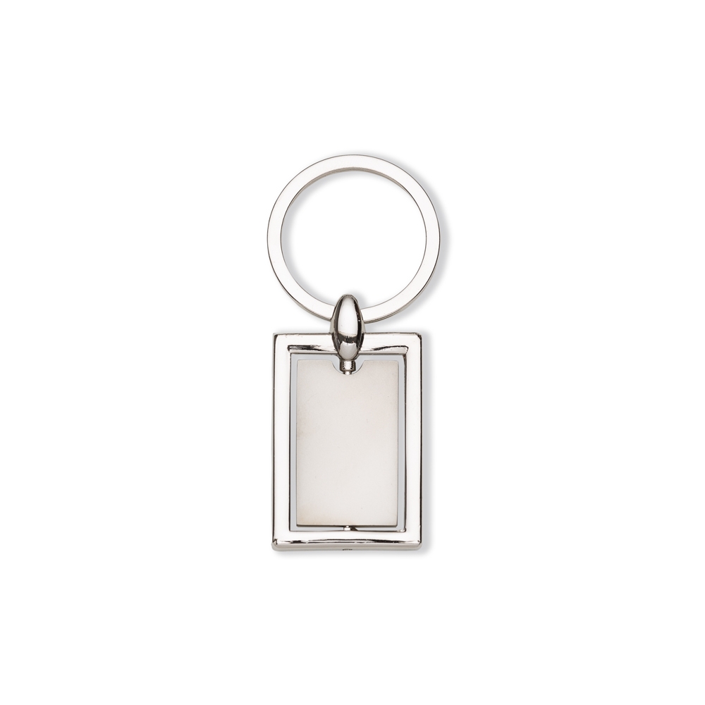 Chaveiro metal retangular giratório, parte central lisa fosca frente e verso, medidas 7,4 cm x 3 cm. Gravação a laser.