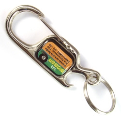 Chaveiro metálico com mosquetão e argola, e detalhe que serve como abridor de garrafa. Impressão através de etiqueta resinada em policromia.