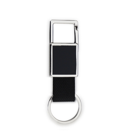 Chaveiro de metal com mosquetão. Chaveiro metálico com chapa central de alumínio na cor preta e verso liso brilhante, possui alça de nylon e mosquetão sem trava. Medidas 9,6 cm x 3,2 cm, Gravação a laser.