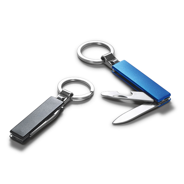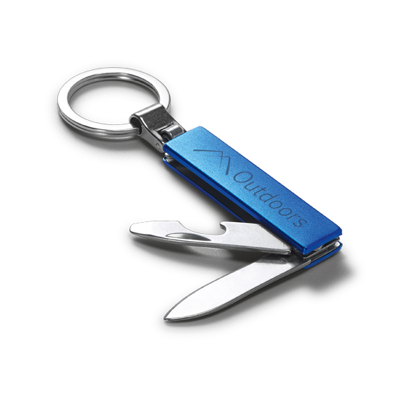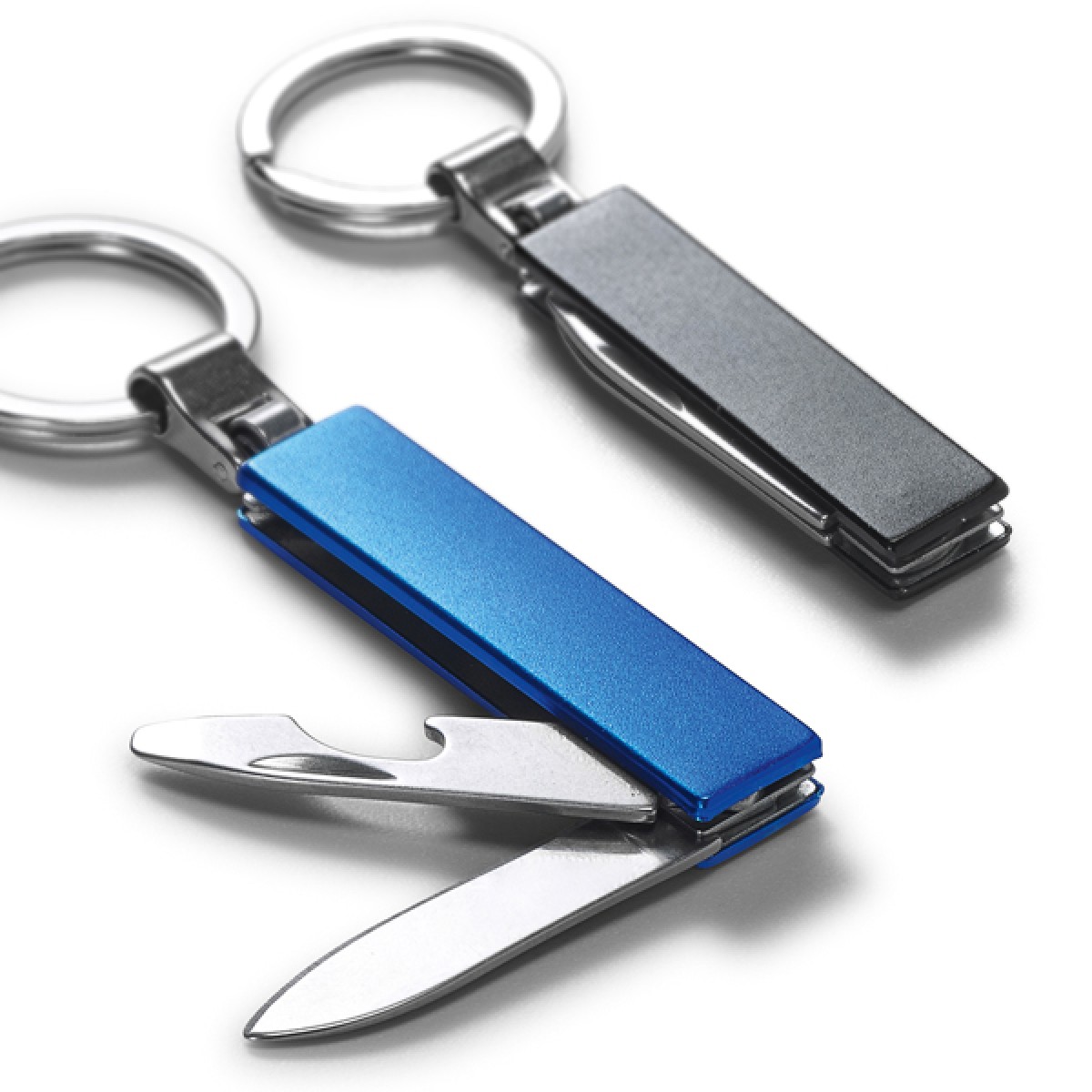 Chaveiro de metal com canivete e abridor de garrafas. Medidas 13 x 55 x 7 mm, Gravação a laser.