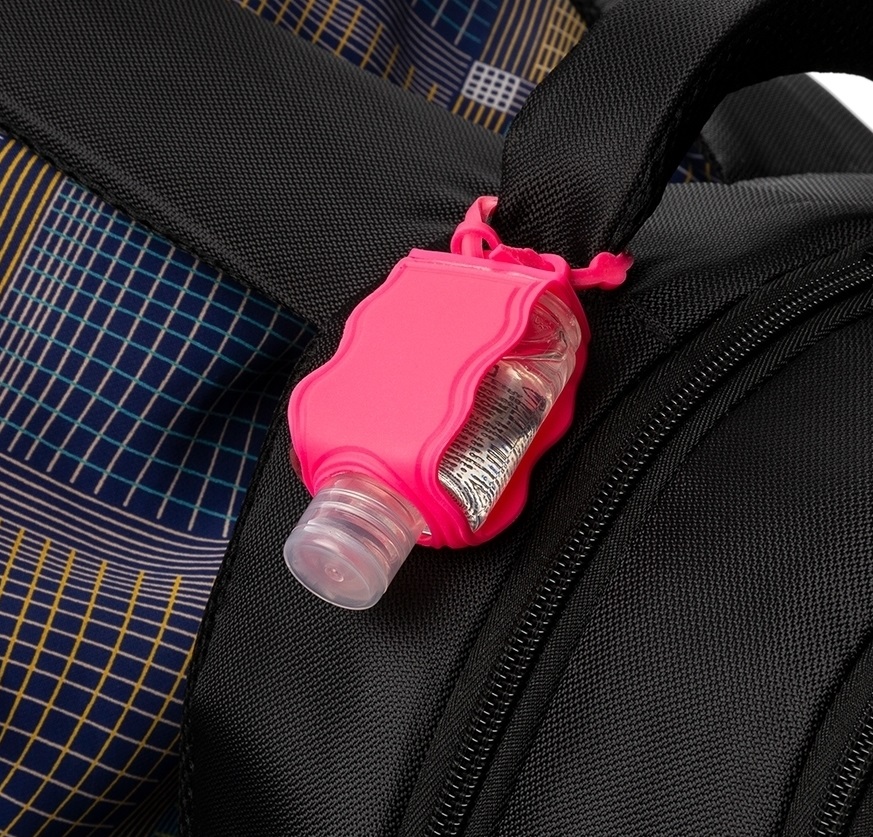 Chaveiro porta álcool gel, material emborrachado, capacidade 30ml. Medidas: Altura : 6,5 cm Largura : 3,7 cm