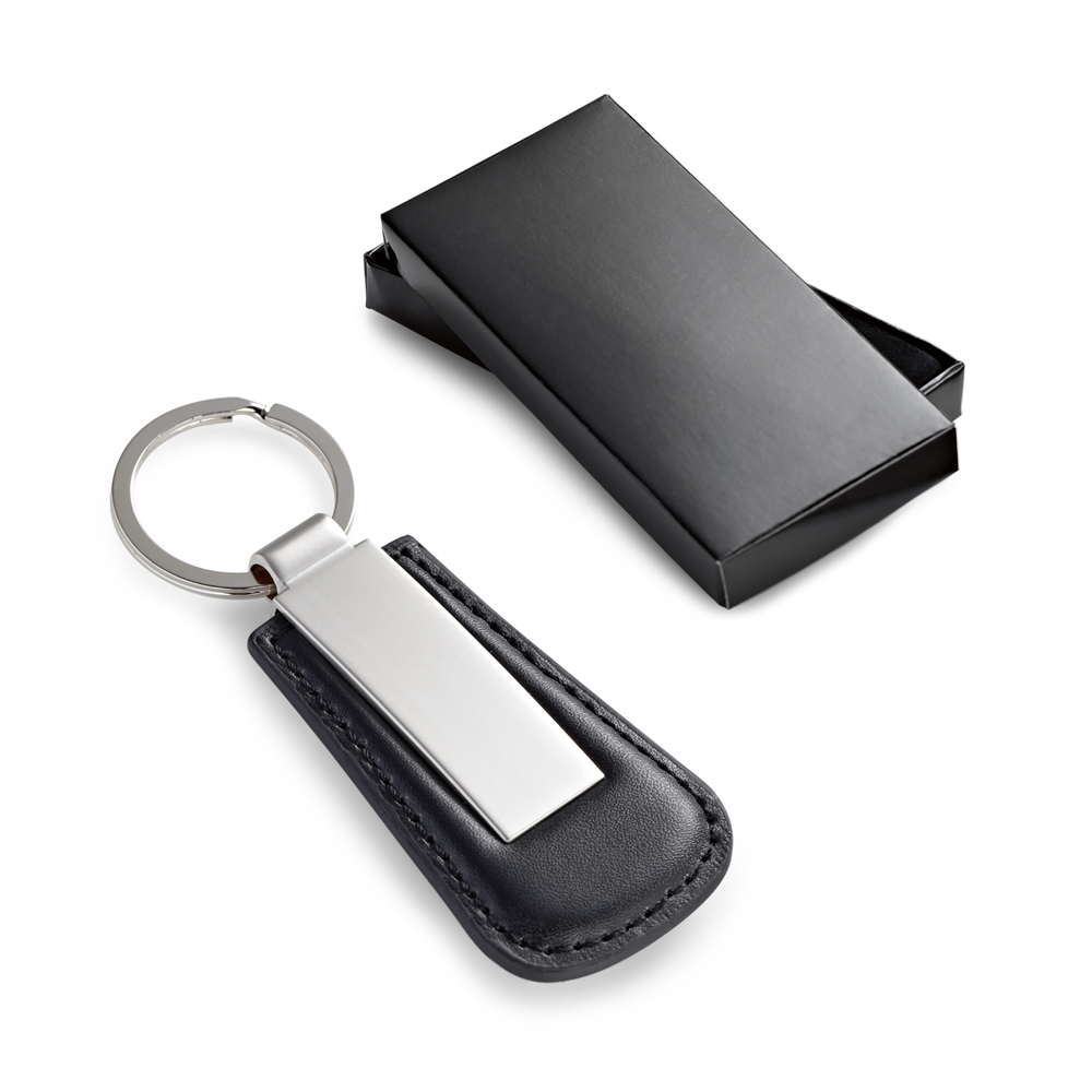 Chaveiro metálico e sintético, medidas 38 x 76 x 9 mm, incluso embalagem caixa preta individual. Gravação a laser.