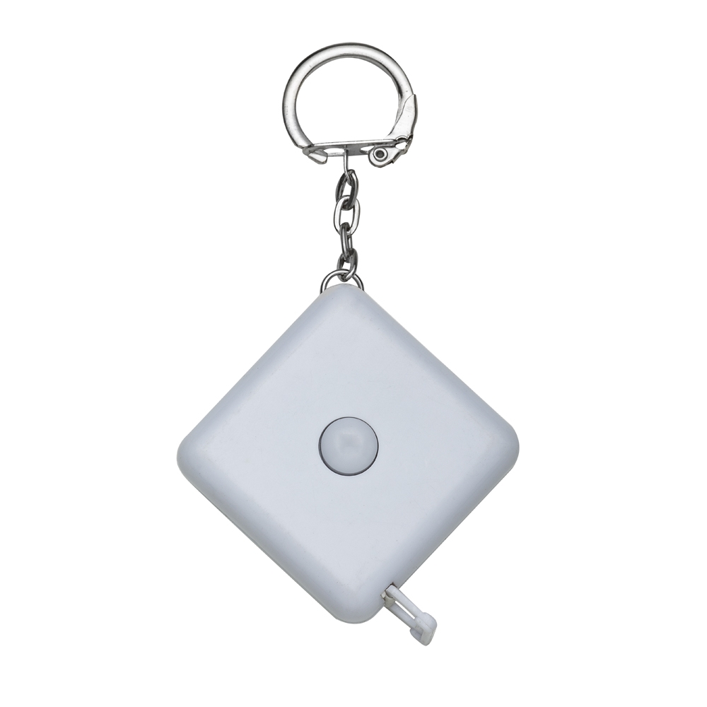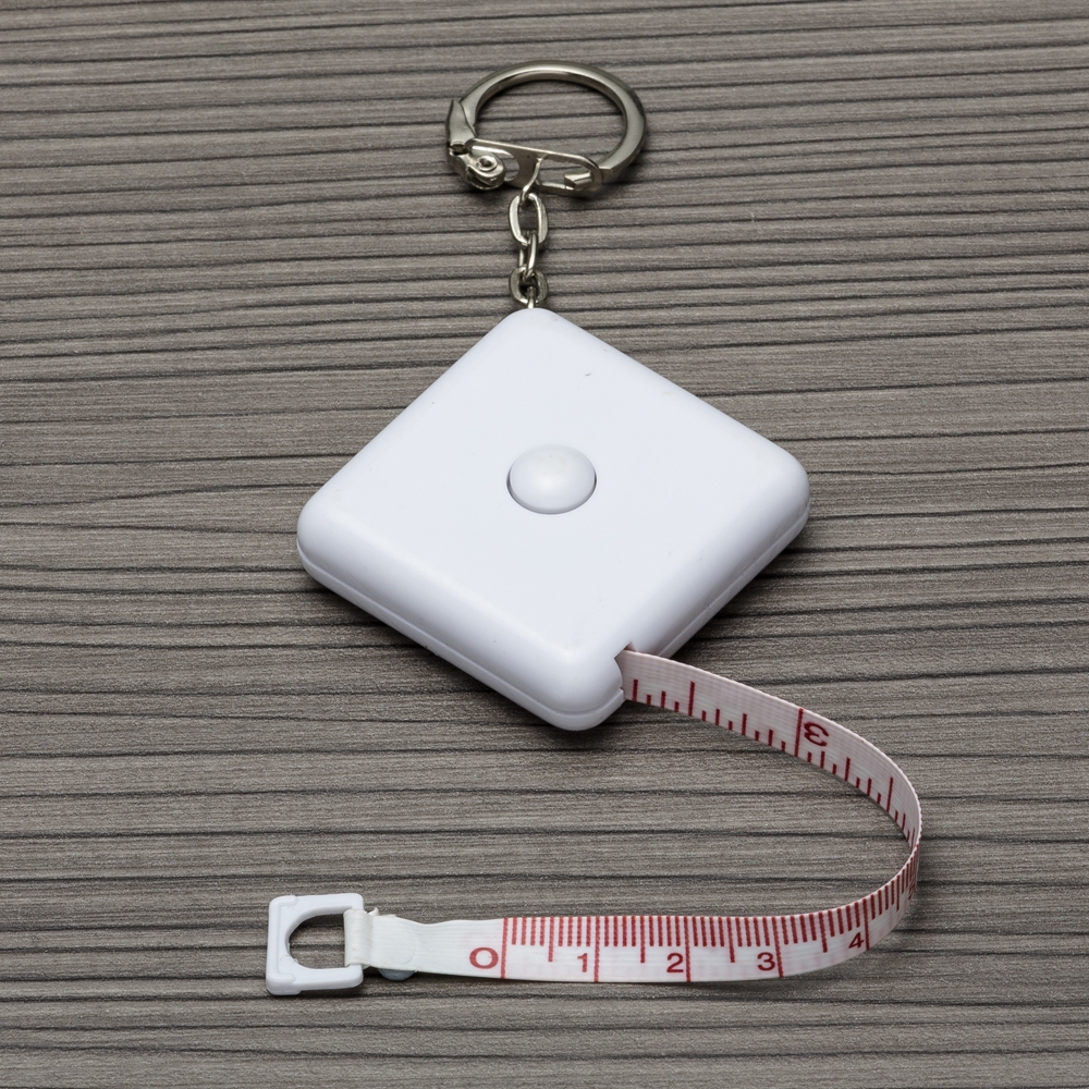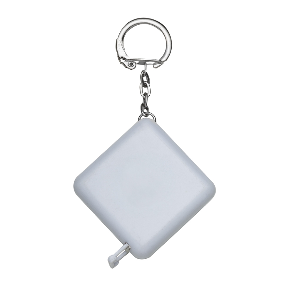 Chaveiro Trena de 1 metro em plástico quadrangular, frente lisa e verso com botão(trava), medidas 4,5 x 4,5 cm. Gravação serigrafia em 1 cor.