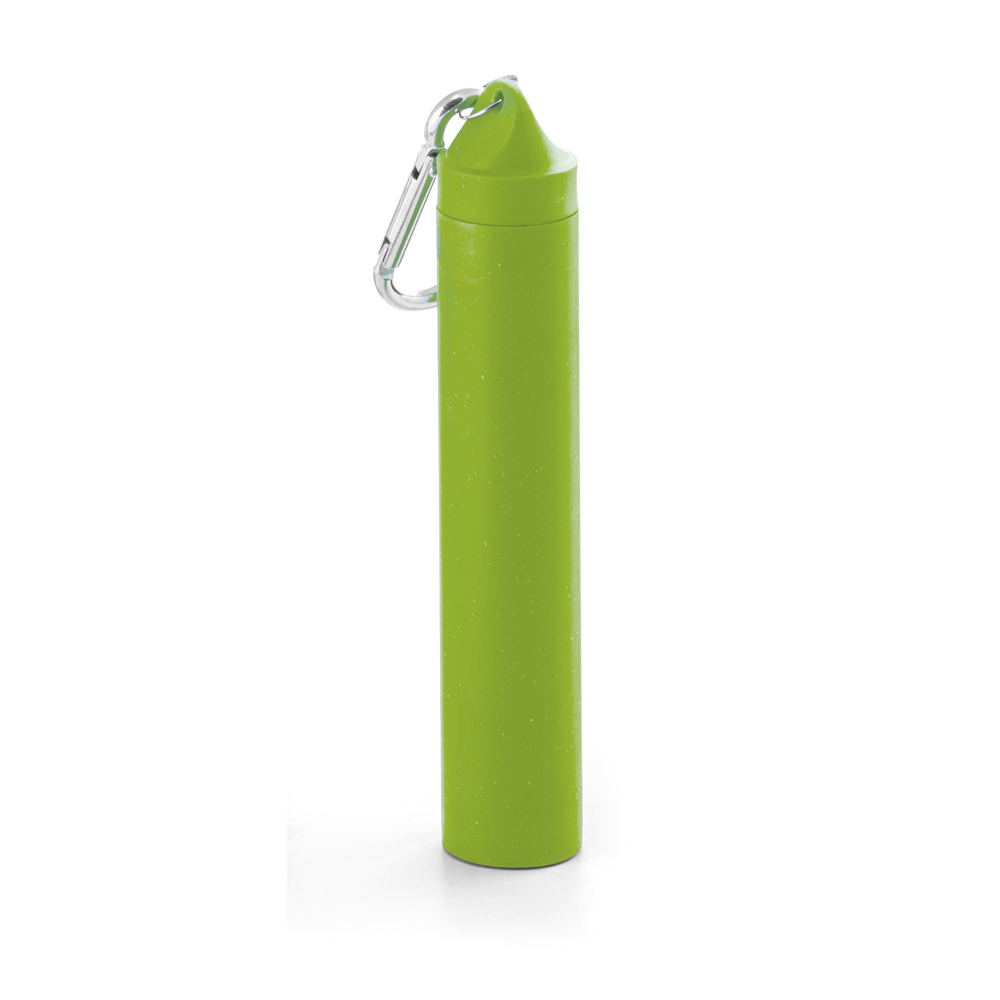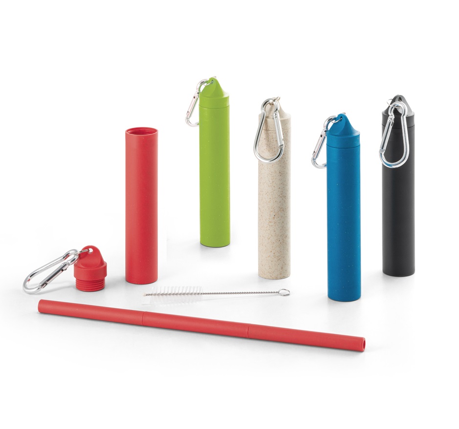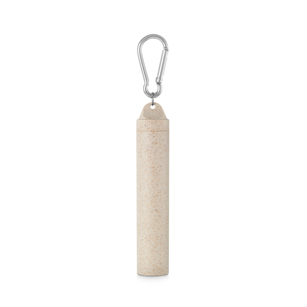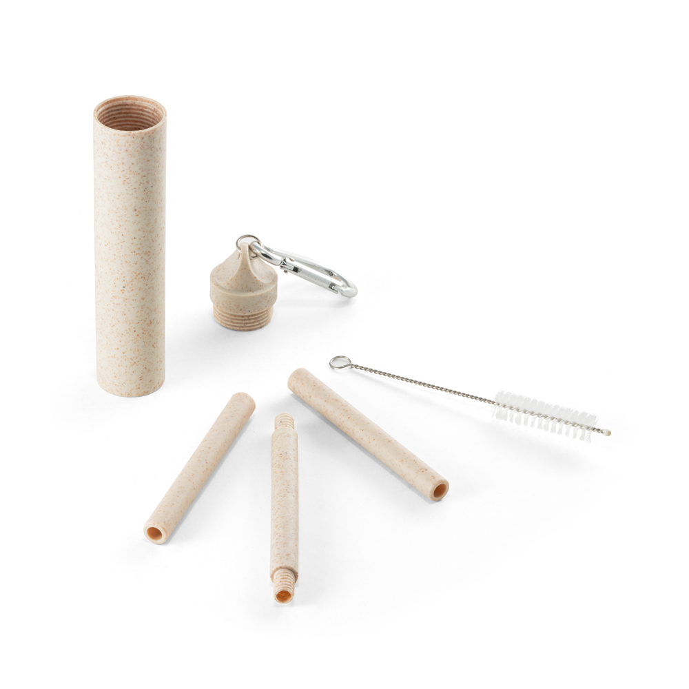 Conjunto de canudo e escova de limpeza produzido em fibra de bambu. Inclui 1 canudo telescópico, 1 escova de limpeza e estojo com mosquestão.