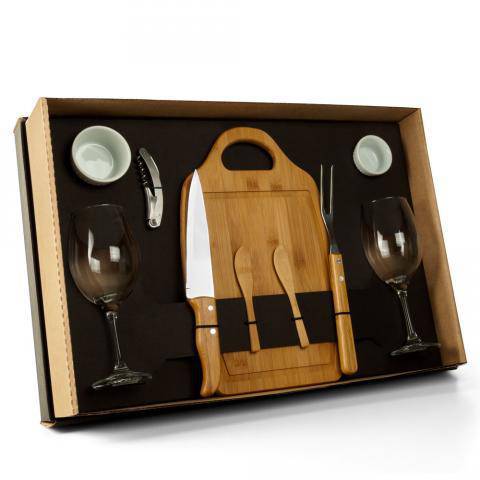 Acompanha tábua com três furos e duas espátulas em Bambu; faca 7” e garfo em Bambu/Inox; dois ramequins em Porcelana; duas taças de vinho em Vidro; abridor em Metal. Dimensões da tábua: 37 x 22,5 x 1,5 cm . Gravação a Laser nas duas taças, na tábua, na lâmina da faca e na tampa da caixa.